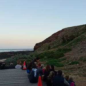 2月12日参加です。夏のため8時過ぎてもまだ明るくパレードは8時45分頃とのことでした。先に展望レストハウスで軽食を取ります。外に出ると、強風と荒波が水平線先のタスマニア、そのずっと先の南極を感じさせられます。そこからさらにバスで丘陵地を徐々に海岸に向けて降りていきます。さあ、パレードの始まりです。ペンギンプラスの席の最前列に座ることができ、間近でみられます。30㎝ほどのペンギン達が、ご近所さん同士グループになるようによちよちと帰ってきます。丘陵地の丘のけもの道を列になり登っていくもの、その先自分の住処に分かれていきます。また、目の前をおなか一杯にした子がつまづきそうになりながら歩くさまは、よくあの大海原を帰ってきたなといとおしくなります。このペンギンたちがいつまでも自然で生きられることを祈らずにはいられませんでした。本当に愛くるしい、いとおしいペンギンさん、感動をありがとう!!とても素晴らしい体験でした。