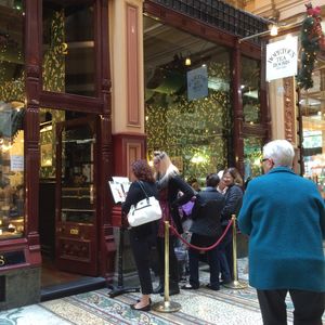 次は前半期待のアーケード巡りへ移動、街中のH&M前から別のガイドさんの案内でアーケード内へ。最古のロイヤルアーケードからひときわ装飾が素晴らしいブロックアーケードを抜けてカフェエリアへ入りました。