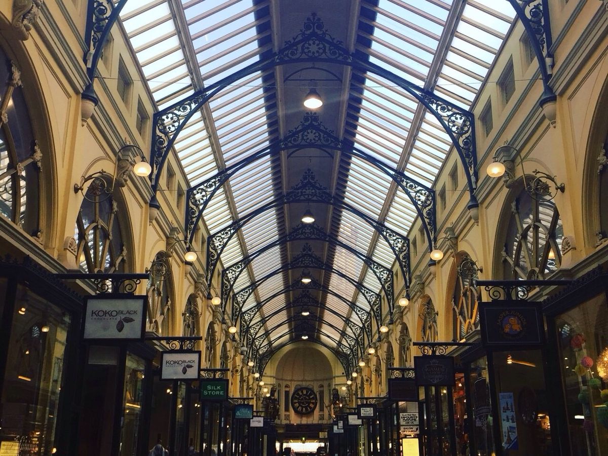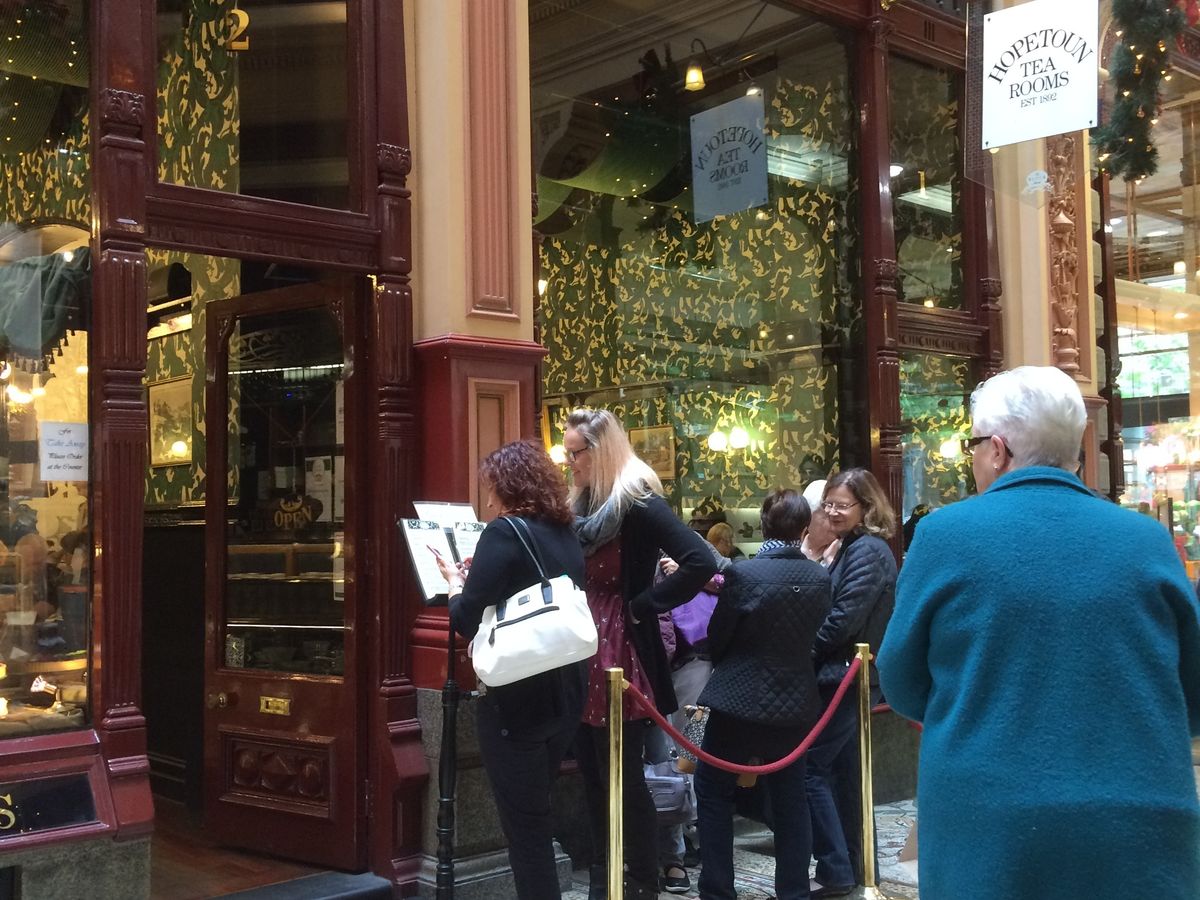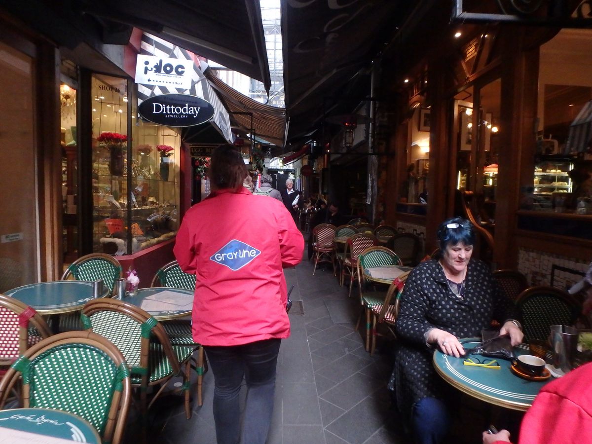 次は前半期待のアーケード巡りへ移動、街中のH&M前から別のガイドさんの案内でアーケード内へ。最古のロイヤルアーケードからひときわ装飾が素晴らしいブロックアーケードを抜けてカフェエリアへ入りました。