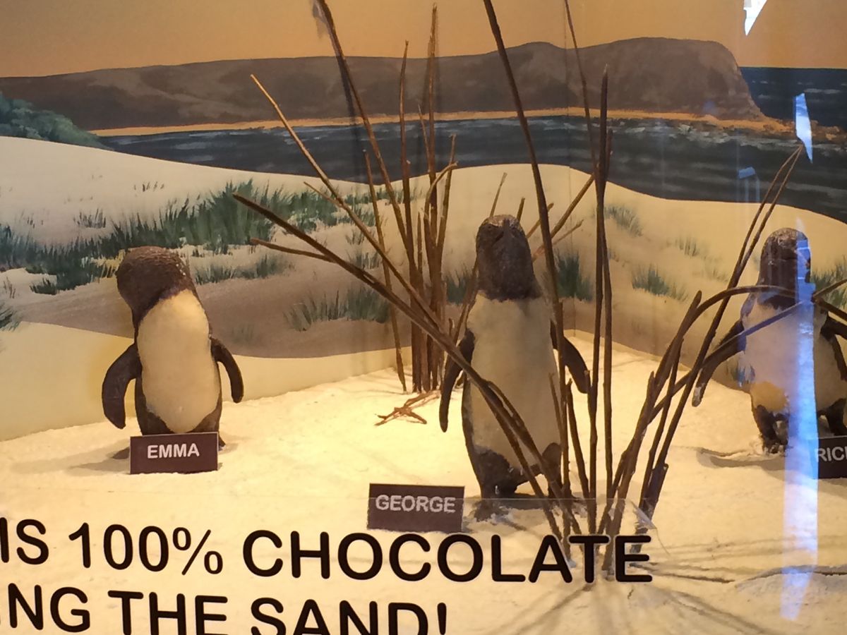 また地元のチョコレート屋さんにも立ち寄りチョコレートの試食がありました。ここにチョコレートで作ったペンギンが展示してあり、かわいかったです。