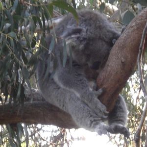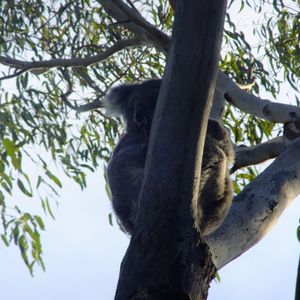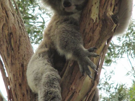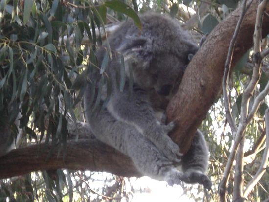 次のコアラ・コンサベーションセンターでも、人の流れについて行きました。反時計回りで進むと 間もなく人だかりがあり、木の上の方にコアラが寝ていました。もっと探さないと見られないのかと思いましたが、各ポイントに寝ているコアラがいて、間近に写真をとることもできました。(触れたり 騒いだりしては いけません)