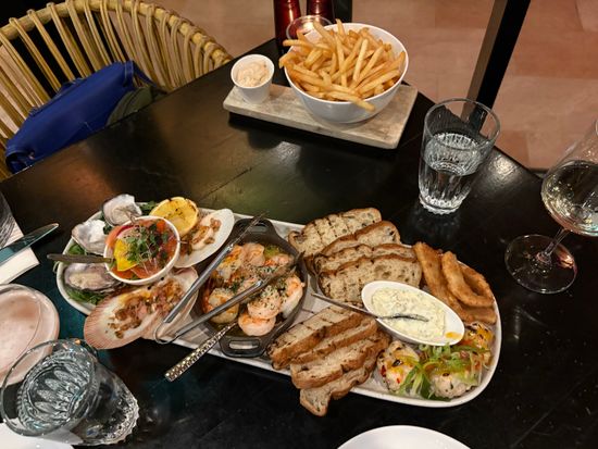 シーフードプラッター、サラダ、デザートのコース料理をお楽しみください。