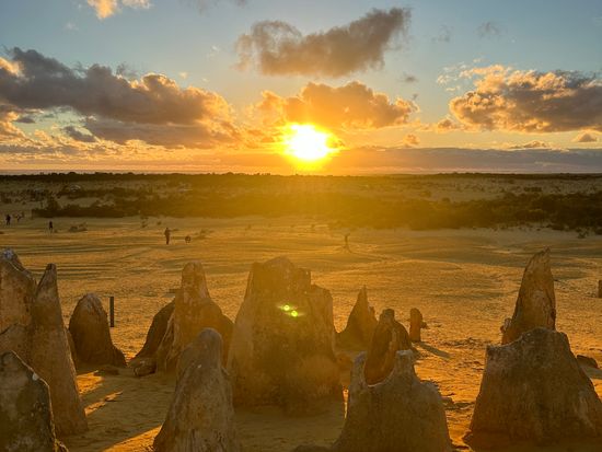 夕日に照らされたピナクルズの間に沈んで行く太陽。大自然の中で幻想的な景色をお楽しみください。