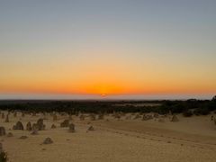 オレンジ色に輝くピナクルズと、美しく染まった夕日が、インド洋の水平線へとゆっくり沈んでい