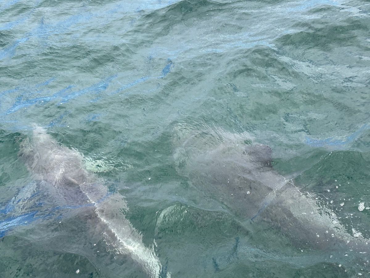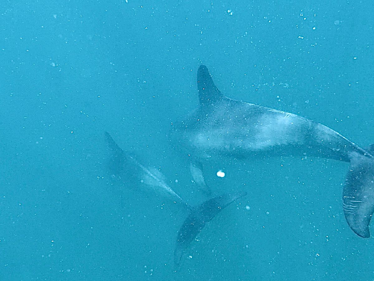 運が良ければ群れに遭遇できて、一気に5頭くらいが近くまで来てくれました。アクティブカメラ(GoProなど)あった方が楽しめるでしょう。海に入るのは各回1分半くらい、合計4〜5回海に入りました。基本はイルカのいる場所を探すのに、船でグルグル移動するような感じでした。