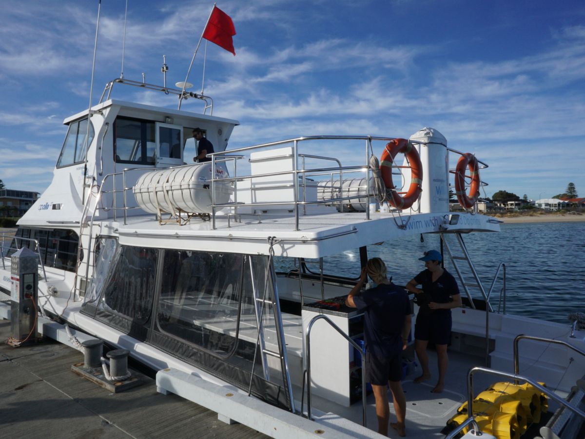 パースのハイアットホテルまで送迎に来てもらうプランで申し込みしました。ロビーで待っていると集合時間を5分過ぎた頃に着信が。電話を取るとスタッフの方がロビーで電話しているのが見えたので、問題なく合流できました。事前に日本のサイトで予約して入力していた情報もしっかりスタッフにまで伝わっているので安心しました。ロッキンハムまでは車で45分ほど。スタッフはドライバーガイドの若いオージーの女性で優しく色々と話しかけてくれました。乗船してからタブレット端末で免責書にサインをしていきます。説明は全部英語でなかなかの早口ですのでフィーリングですが、餌付けではない野性のイルカを探しに行くよ、一緒に泳いでくれるのは人間で言うと幼稚園児にあたるような子どもイルカだよ、のようなことを話していたと思います。エコツアーなので、ただハワイみたいにレジャーとしてイルカと泳ぐだけでなく教養も伝えるのですね!