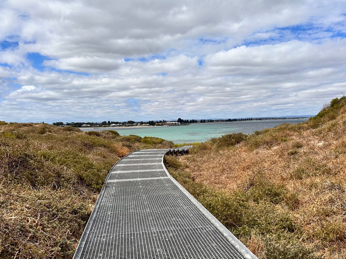 行きは7時20分頃にロッキンガムビーチの繁華街の路肩に到着(ショップで降ろされるわけではない)、ドライバーの方に「向こうの方の桟橋に7時50分に集合」と言われました。とはいえ、初めての街で降ろされた場所からは桟橋も見えず、土地勘もなく、他の同乗者は知らない人、という状態で個別の移動は不安です。朝から開いているカフェもあるので、朝食調達や準備も兼ねてという配慮なのかもしれませんが、ショップか桟橋近くまで送迎してほしいなというのが正直な想い。他国のシャトル同乗者も不安で、降りてからドライバーの案内を相互に確認。結論、海岸に出て確認、桟橋は1つしかなく500mくらい歩いての到着です。途中のビーチ沿いの公園には広めのトイレもあるので着替え等の準備をここでするのもよいかもしれません。