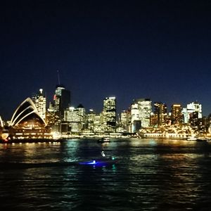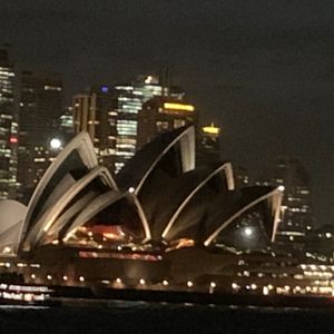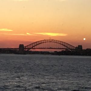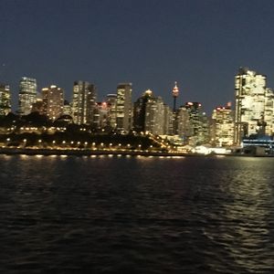 17時半頃日没の時期で出航が17時。食事をしながら夕日に輝くハーバーブリッジとオペラハウス両方を堪能できました。特にオペラハウスは、水辺側からそびえ立つ姿を鑑賞できたのは良かったです。夜景はスカイアイを含めたビル街全体のシルエットが綺麗でした。