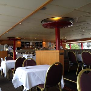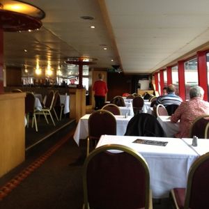 でした。11時半くらいに乗り場へ行きましたが、船はあるのに、乗る人が誰もいなく不安になりましたが、10分くらい前になり、ようやく10人くらいの団体客も到着し、乗船しました。もしかして、今日のお客はこれだけ?と思いながら窓際の席に案内され出発しました。案内は英語でしたので、内容はよくわかりませんでしたが、バイキングですので特に問題はありませんでした。コーヒー、紅茶は料金に含まれているのセルフサービスでOKです。その他のミネラルやソフトドリンク、アルコール類は別料金でしたが、無理に頼まなくても大丈夫です。