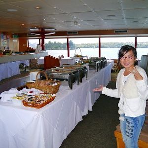 11時半に間にあうよう必死でダーリングハーバーに駆けつけましたが、結局12時5分過ぎに船は到着しました。天気は、曇り時々晴れ間と小雨でしたが、室内で寒くありません。窓際の席からは、オペラハウスを別の角度から見られ、外輪船やエンデバーもしっかり写真に撮りました。就航して間もなく、調理のいいにおいに包まれました。何種類もの料理が並び、お皿いっぱいにとりました。どれも悪くない味です。私たちの席のすぐわきに、ケーキとカットフルーツが置かれていたので、食後のデザートに紅茶とともに味わいました。途中から乗船の方々のために、すぐ料理は補充されて十分でした。夢中になって外を見ていると船内のステージの方からガイドさんが、下船までずっと説明のしっぱなしでした。英語でしたから少しわかる程度でしたが、サービスもいいように思います。船に弱いかたにも安心してのれます。2時間が、あっという間でしたが、あとで航路をみるとけっこう遠くまでいっていました。その後の滞在中フィッシュアンドチップスを3回ぐらいいただくチャンスがありましたが、こちらの料理の方がおいしかったです。次回は、天気のいいときに船外の空気をいっぱいに吸いたいと思います。