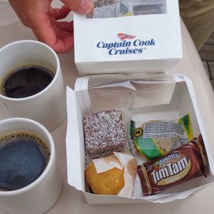 カップルや夫婦、友達同士や家族連れなどいろんな国の方々がたくさん参加されてました。たまに一人参加もいました。乗る前にチェックインしてチケットをもらうと、クック船長なような格好をしたキャプテンクルーズのキャプテンがうろうろとしていて、一緒に写真を撮ってもらいました!バウチャーをコピーしていなかった私たちのチェックインはとても時間がかかりましたがカウンターの方がコピーしてくださりとても助かりました。飲み物もコーヒーから様々な美味しいソフトドリンクがおいてあり、お菓子と一緒に美味しくいただきました。お菓子は可愛い箱の中に5種類ほどはいっており、ケーキが特においしくて飲み物とよくあいました。私は船に酔いやすい体質なのですが、まったく酔うことがなくオーストラリアの雄大な景色を存分に楽しむことができて本当に感動しましたし、もう一度このクルーズに乗りたいと思いました。船の中は綺麗で、一階と二階のつくりが異なっていたことも興味深かったです。