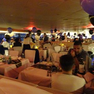 トイレが1階にあったので、1階のフロアと2階のフロアの様子を見ることができました。各階ごとに料理と雰囲気が違ってました。1階が大盛りなら2階はダンスしてたり、最上階は静かに音楽を聴いているような感じです。料理も最上階は私達には高級すぎて難しかったです(笑)私達には2階の料理の方が馴染みがありそちらにすればよかったと思いました。スカイデッキは風が強く寒かったので、カウントダウンの10分くらい前に行くと、ロープが張られて前方には行けず後方でしか見れなかったのが残念でした。しかし花火は長時間打ち上げられていてとても素晴らしかったです。帰りが1時の予定でしたが港が混雑しているのか?順番があるのか?港に到着したのは2時でした。