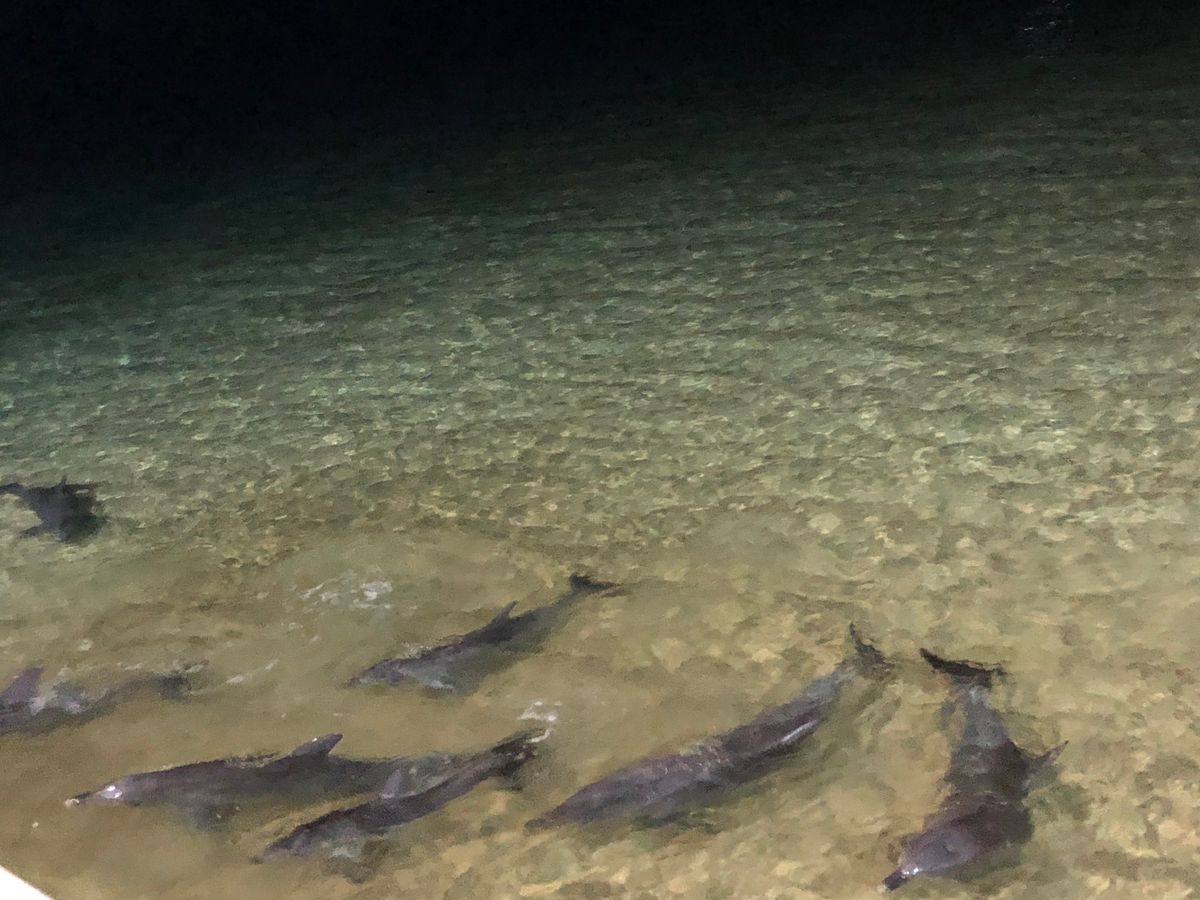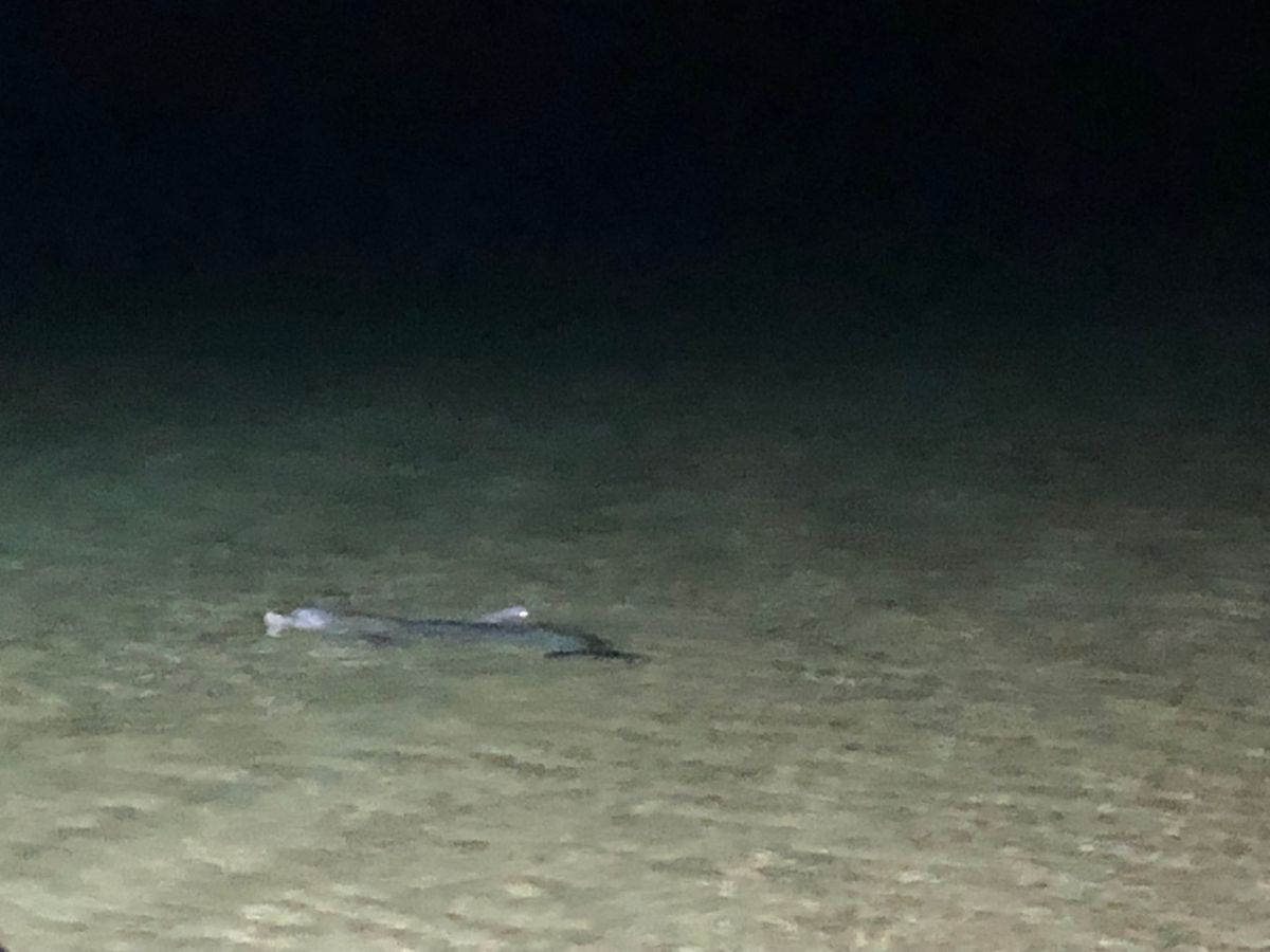 夕方桟橋に行ってみるとイルカが6頭ほど来ていました。イルカの餌付け頃に雷が見えていましたが無事餌付け成功です。ちなみに私はタイミングが遅かったためイルカの歯が手に・・。