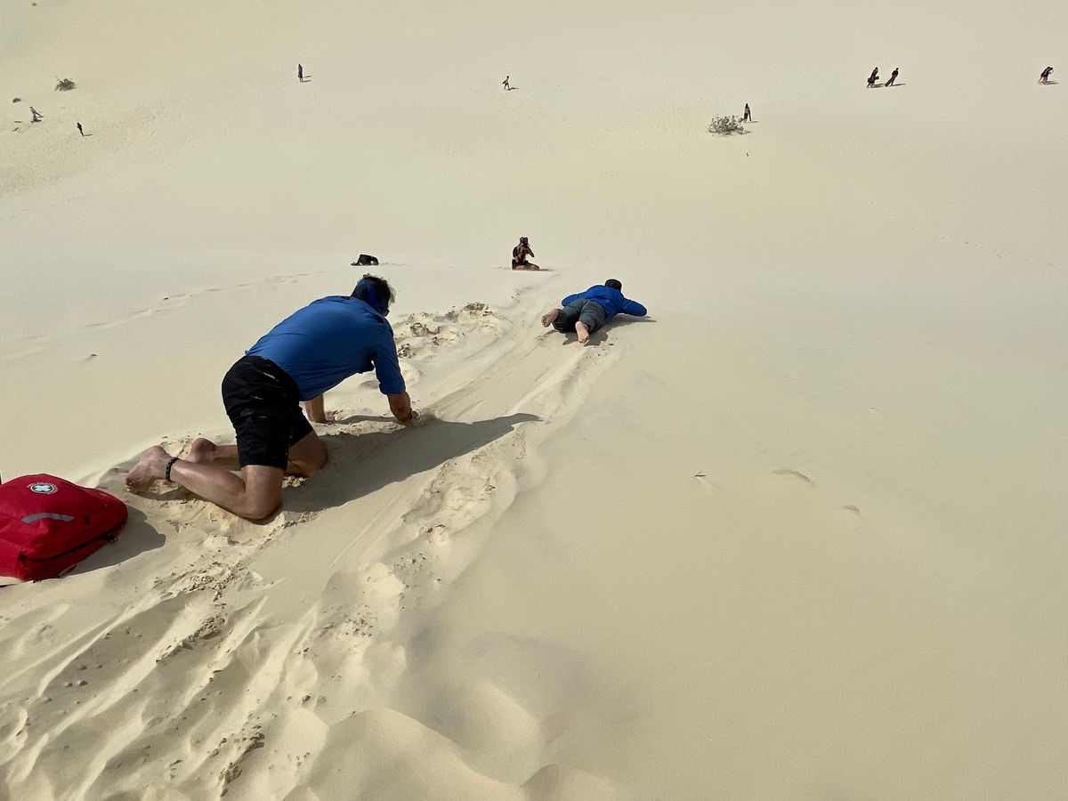 ランチタイム後、砂滑りの待合所まで行き大きめのバスに乗り込みます。私達はバス2台で参加人数沢山いました。着いたら1人づつ板をもらって砂滑りに挑戦します。少し怖いですが、皆さん上手に楽しまれていました。ただかなり口や顔に砂がつきます。ゴーグルを貸してもらえますが、サングラスやマスクを持参するといいかと思います。3回位滑れるみたいですが、砂山を登るのが大変で1回にしました。