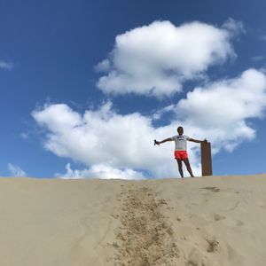 砂山を上るのは大変でしたが、滑り降りるときの爽快感は最高でした!!砂をたくさん食べちゃったと伝えたら、ボードをしっかり上げるといいと教えてくれて2回目は気を付けて滑りました。