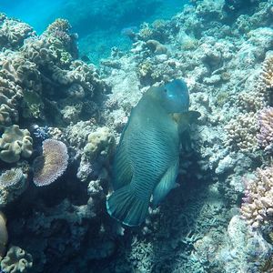 当日は7:30にホテルでピックアップしてもらいすぐに港に到着。受付後陽気なクルーと挨拶を交わすと中には外国からのツアー客含め50人くらいはいただでしょうか。みなさんのレビューにもある通り日本人は2回の部屋へ通されます。2階は操舵席もあり船長の操縦を間近で見ることができ、ソファーも設置されてるため濡れたままだと入れません。当日は風も強くかなり揺れるとのことで酔い止め薬は必ず飲むよう促され、エチケット袋を渡されます。そんなに揺れるのかと思いつつ、船酔いを考慮し、買っておいたバナナマフィンを一口だけ食べ8:00に出航!書類を書きつつ説明を聞き、20分もしないうちに揺れが始まり、あっという間に立てないほどの揺れに・・・早くもリバースする方も出始める中、2階にあるデッキへ。強風&波をかぶりながらですが、外にいる分多少は気が紛れ景色を楽しんでましたが、揺れはなかなか収まらず・・日本からの参加者はほぼ全滅状態。幸いリバースすることなく、約2時間で目的地へ到着。きれいな珊瑚礁が船から見えるも気分が悪くテンションはさほど上がらず。アンカーが降ろされ、まずは動ける方はシュノーケリングに行きましょう!ということで道具を渡され外国のツアー客とシュノーケリングへ!若干波が高い中珊瑚礁に向けて泳ぎ開始。初めて見る広大な珊瑚礁とたくさんの魚たちが現れようやくテンションが上がる。とにかく魚の種類が多く、まるで水族館の中を泳いでる感覚。巨大ナポレオンフィッシュも現れ、この時点で来てよかったと思ってしまう。30分ほどして船へ戻り、ダイビングポイントへ15分ほど移動。その間もやっぱり揺れる・・ ポイント到着後ウェットスーツ(長袖半ズボンでした)に着替え手際よく準備をしてもらいいざ入水。