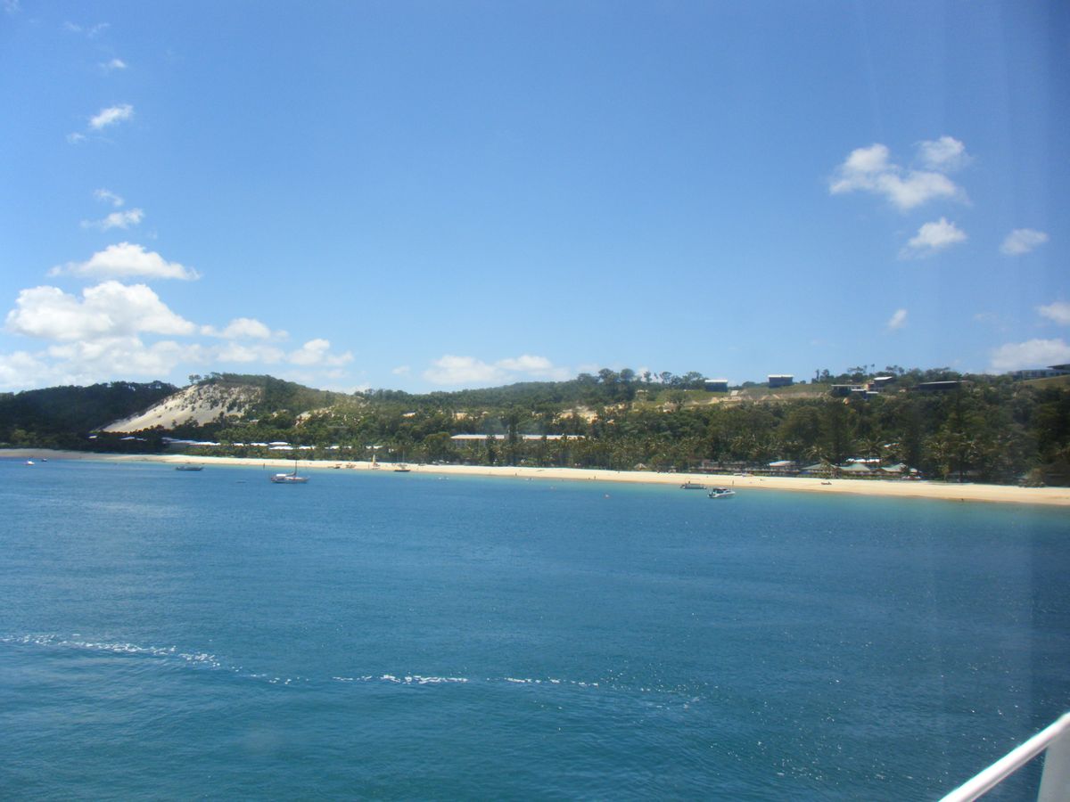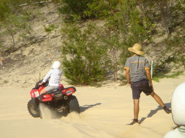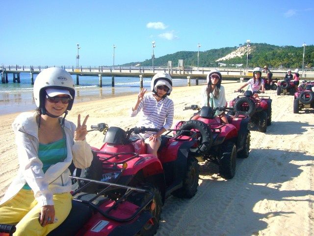 さて、モアトン島の魅力ですが…やっぱりきれいなんです。私が行ったときはとっても天気がよかったですよ、もちろんシュノーケルや砂すべりを楽しんで、後はバナナボートで彼と絶叫&バギーに乗りに行きました。バギーは、そんなに速度出ないんですが、島の高いところの絶景が最高なんです。前にも一度とっても感動したのでまたどうしても見たかったのでよかったです。あれは感動もの。天気がよければ是非参加してみてください!広い砂地をちょっと荒々しく運転させてくれるのもとっても楽しかったですよ。