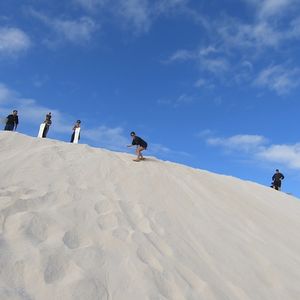 り板で腕にケガをする恐れがあります。大人はみなさん1回しか行っていませんでした。ガイドにいって勾配の緩やかなところで行うととっても楽しいし危険も少ないです。また滑ったあと砂山を上がって戻ってくるのが大変です。