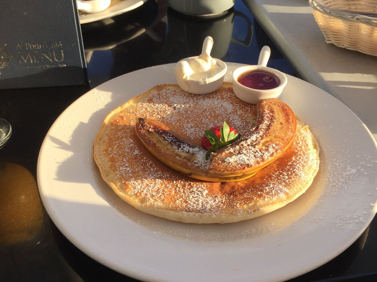 飛行機は機内食をつけなかったので体験談を見て大きいパンケーキと書いてあったけどお腹が空いてるから食べれると思っていました。ところが本当に大きなパンケーキで半分食べたらすごくお腹いっぱいで残してしまいました。でもバナナパンケーキは