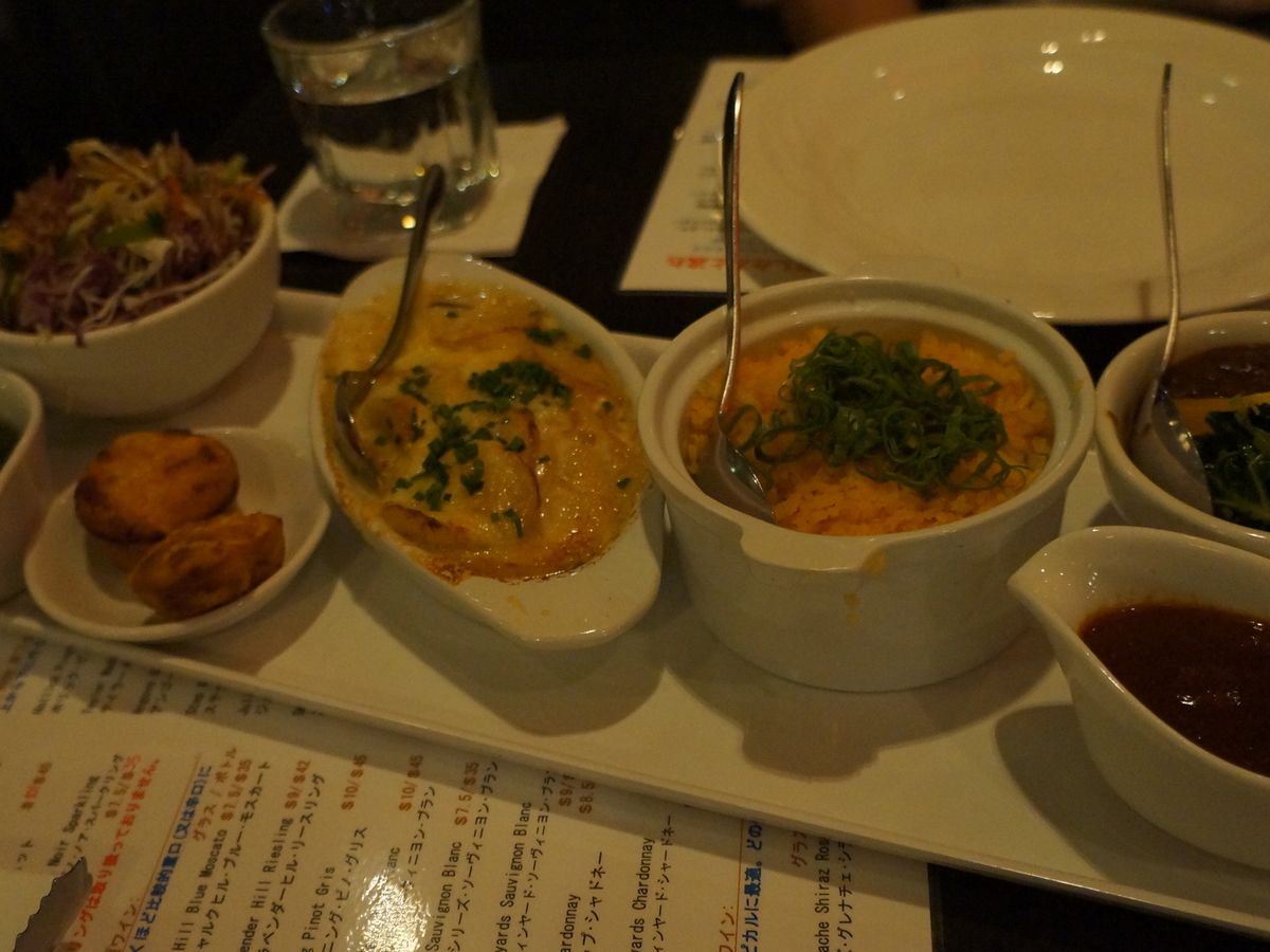 最初に小分けにされたグラタンとかサラダとかターメリックライスとか豆の煮物的なものが