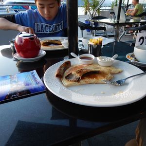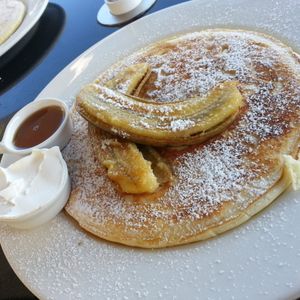 パンケーキは結構大きくて、焼きバナナがおいしかったです。私には甘すぎず、食べやすかったです。港のそばで、日差しが気持ちがよく満足でした。