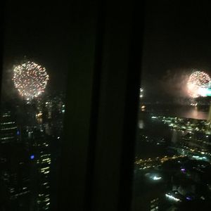 花火はたくさんの場所から上がる花火を全部観れるという意味では良かったが、高層ビルに阻まれて観られないところは残念。