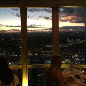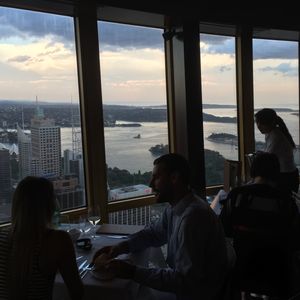 このサイトで予約をしてすぐにコンファームのメールが届きました。夕日と夜景、両方見たくてサイトでシドニーの日の入りの時間を調べ、18時ちょっと過ぎという早めの予約にしましたが、バウチャーを交換するデスクは、週末だからか既に長蛇の列。ローカルの方たちが素敵なドレスを来て並んでいたましたが、どうやら結婚式の二次会みたい。バウチャーを見せ、予約があることを確認してもらい、エレベーターで上へ。(何階か忘れてしまいました。。最初のストップの階が360バーです。一つ上の階がビュッフェ式のレストランです)写真も添付しますが、入ってすぐにうわー!と声が出てしまう華やかさ。笑顔で迎えてくれてとても綺麗なオーストラリア人女性ウェイターに案内され着席。ビュッフェ式ではないのがまた優雅。このサイトで申し込んだのはコースメニューで、スタッフの方もそれを知っているようで、コース用のメニューを持ってきてくれます。3コースを頼んでいたので、何種類かある前菜、メイン、デザートをオーダーします。私は前菜に牡蠣、メインにお肉料理とチョコレートケーキを頼みました。ドリンクは含まれていませんでしたので、炭酸水を注文。料理は割りとゆっくり出てきます。しかし景色が素晴らしいので飽きません。回転するレストランでは360度シドニーを眺めることができます。日が沈む前と後では景色が全く違うのが興味深い。1周するのに15〜20分くらいかかるくらいの速さなので、初めは少し違和感を感じますが、もちろん酔うほどではありません。スタッフも皆優しく、プロフェッショナルな方たちなので、記念撮影にも応じていただけました。料理に関しては見た目に凝っていて、崩すのがもったいないくらい。日本のフレンチなどと比べては辛口になってしまいますが、十分満足の味です。小さいのかなと思いましたが、意外とボリュームがありました。料理の写真はうまく撮れなくて逆に添付するのが失礼なので、やめときます(笑)。次は記念日に来ようかなぁ。おすすめです!