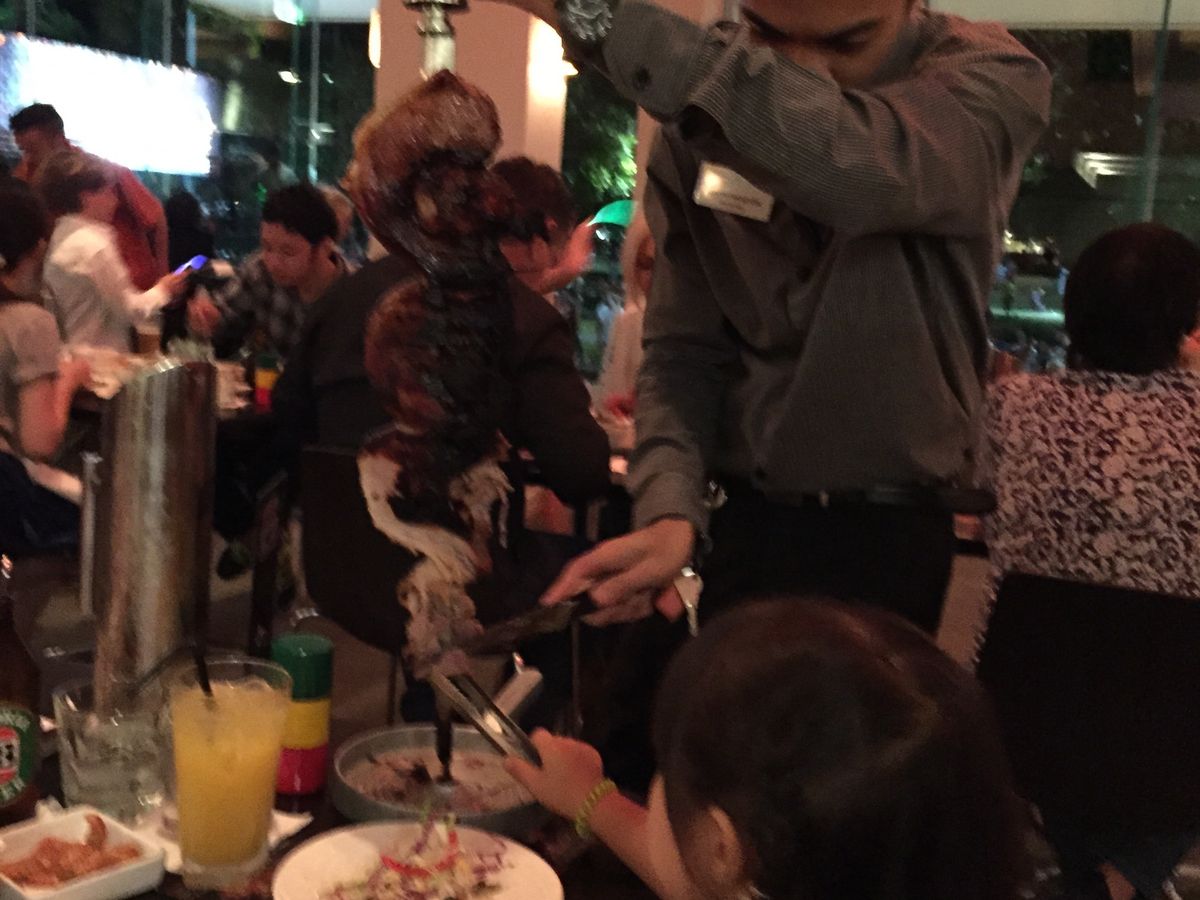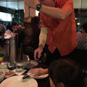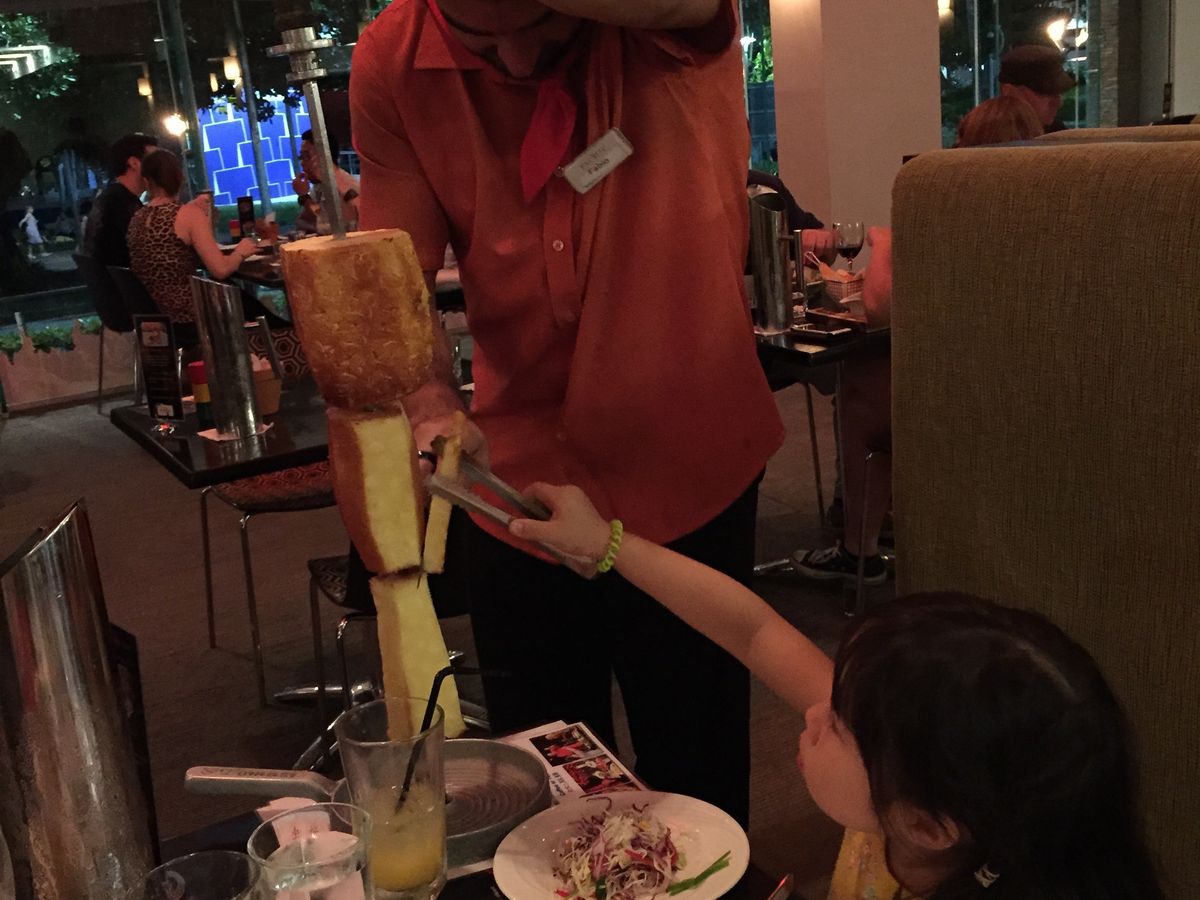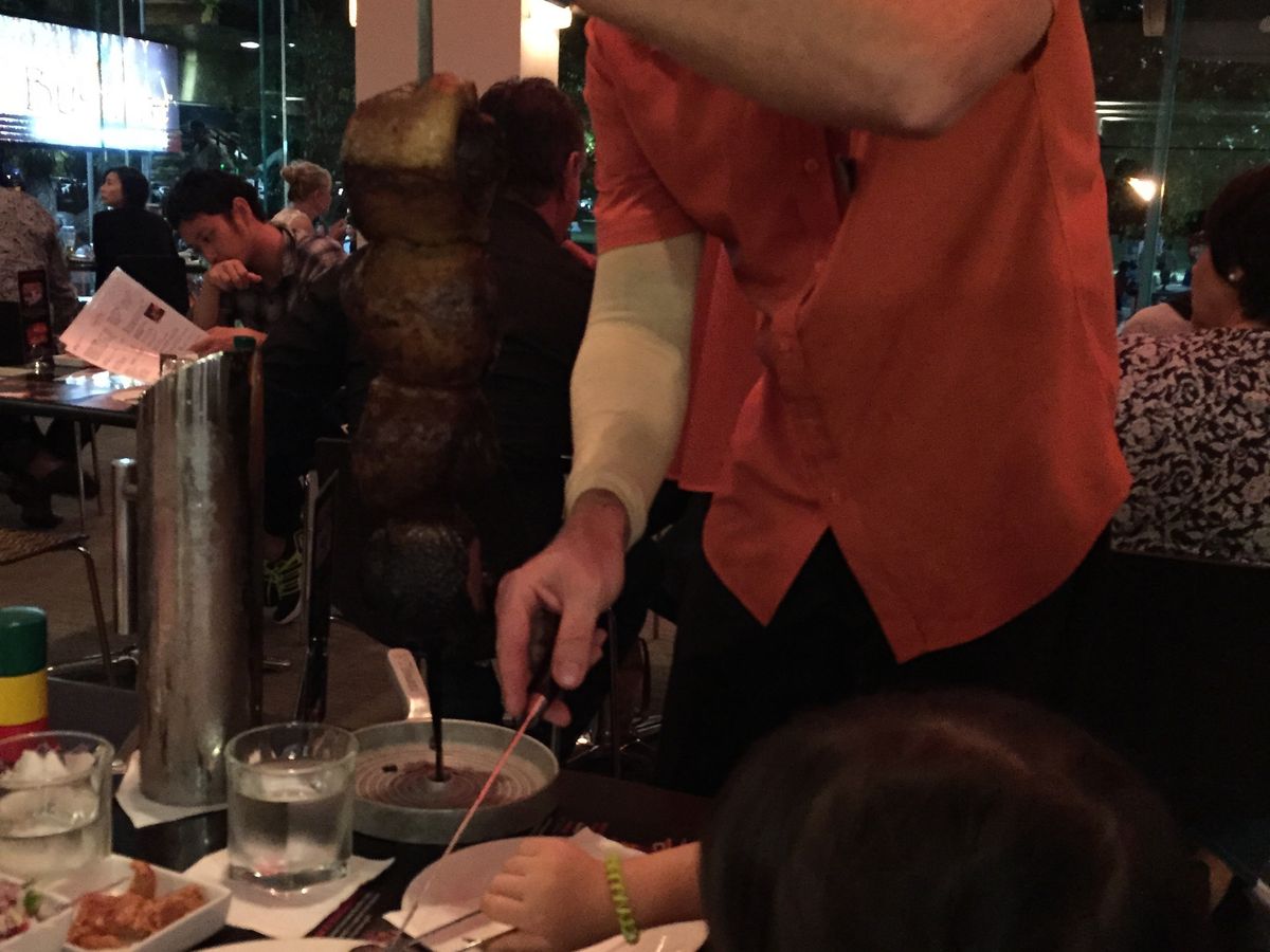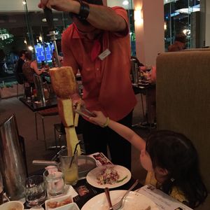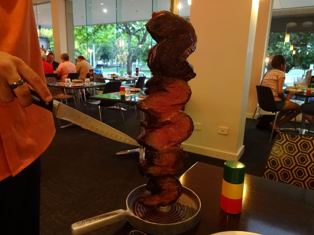 目の前で、ビーフ、ポーク、ラム肉の大きな串焼きををカットしてくれます。食べ放題なので、その日はランチ抜きで、おなかをすかして行くことをおすすめします。前菜で、サラダ、ポテトのチーズ焼き、ごはんなどつきますが、これらもおかわり自由です。チュロスを注文したかったのですが、おなかいっぱいで注文しませんでした。結構にぎやかなレストランなので子供連れでもOKかと思います。ケアンズに来たら、ぜひ寄ってください。