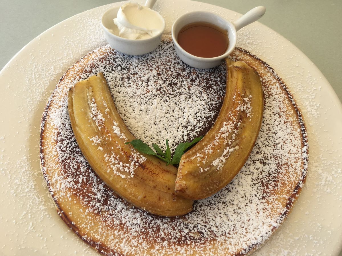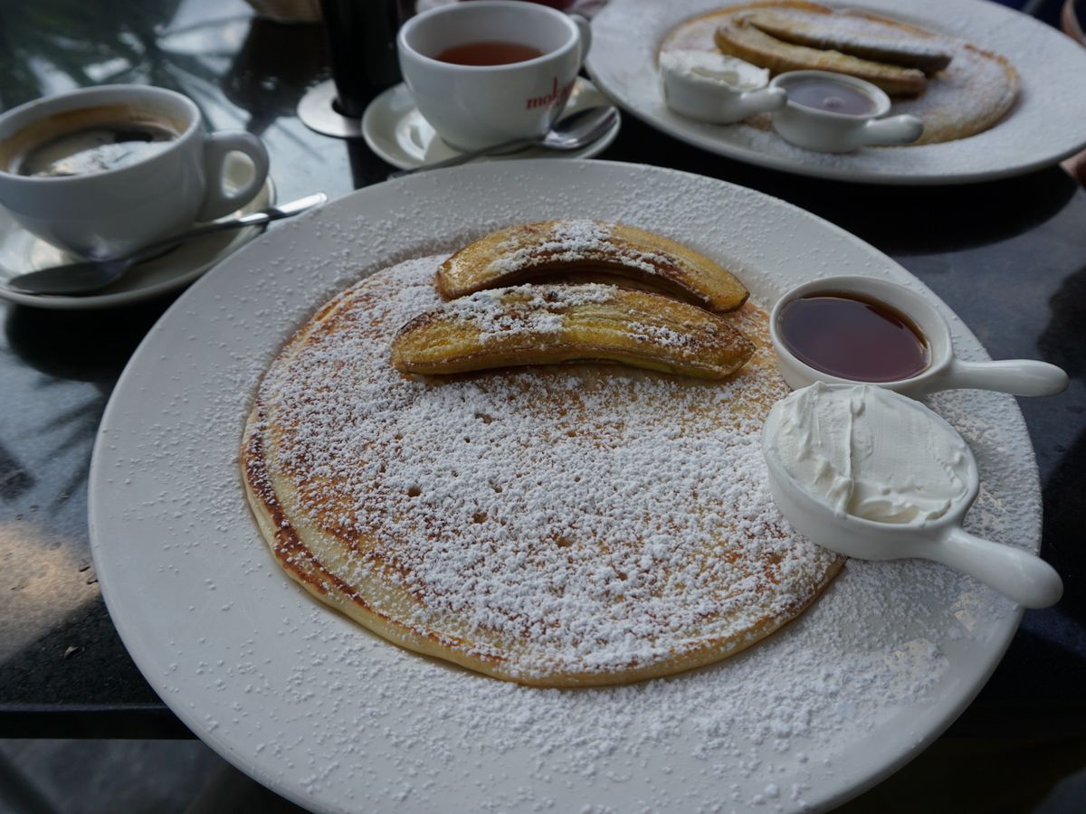 パンケーキは結構大きくて、焼きバナナがおいしかったです。私には甘すぎず、食べやすかったです。港のそばで、日差しが気持ちがよく満足でした。