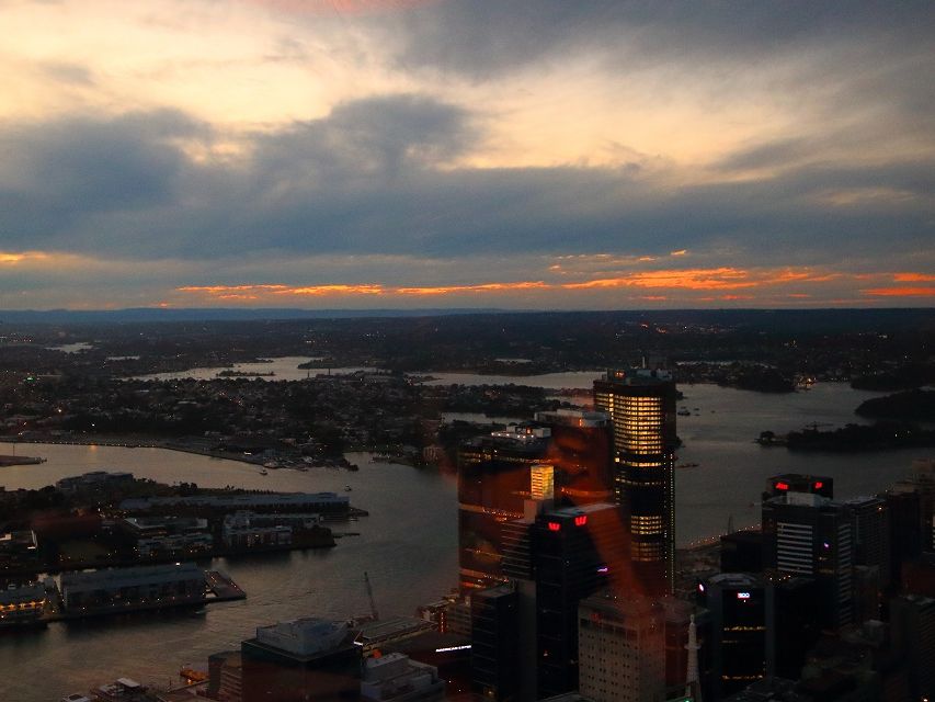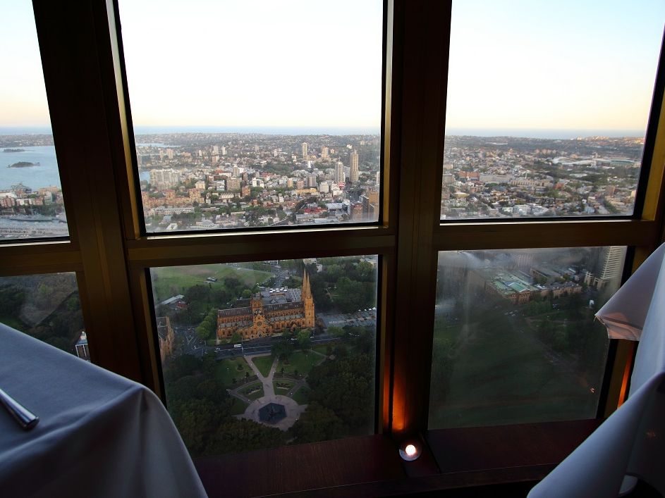 こちらはエレベーターに乗り、予約通り指定の席についた。素晴らしい眺めだ。日没までは時間があるが、徐々に暮れて行くシドニーの街を眺めながらの食事はとても優雅で美味しい。スタッフも親切だ。天気の善し悪しもあるけれど、まずはここでシドニー全体を眺めながらの食事がおすすめだ。2時間以上も360°の眺望を楽しみながらゆっくり食事が出来る。