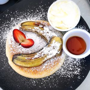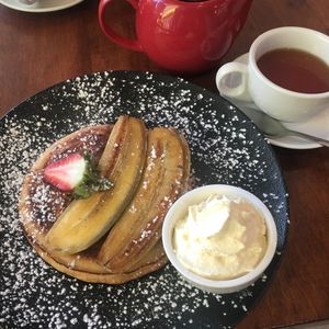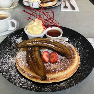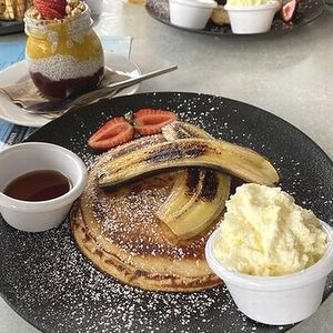 海風を感じながらテラス席でいただきました。スタッフの方の対応もよく、メインのパンケーキもとても綺麗な盛り付けだったのですが…生焼け?だったような。焼けている部分はとても美味しかったです。バナナも皮ごと食べれます。私は美味しく食べれましたが、好き嫌いが分かれるようで友人は皮は食べれないと言ってました。