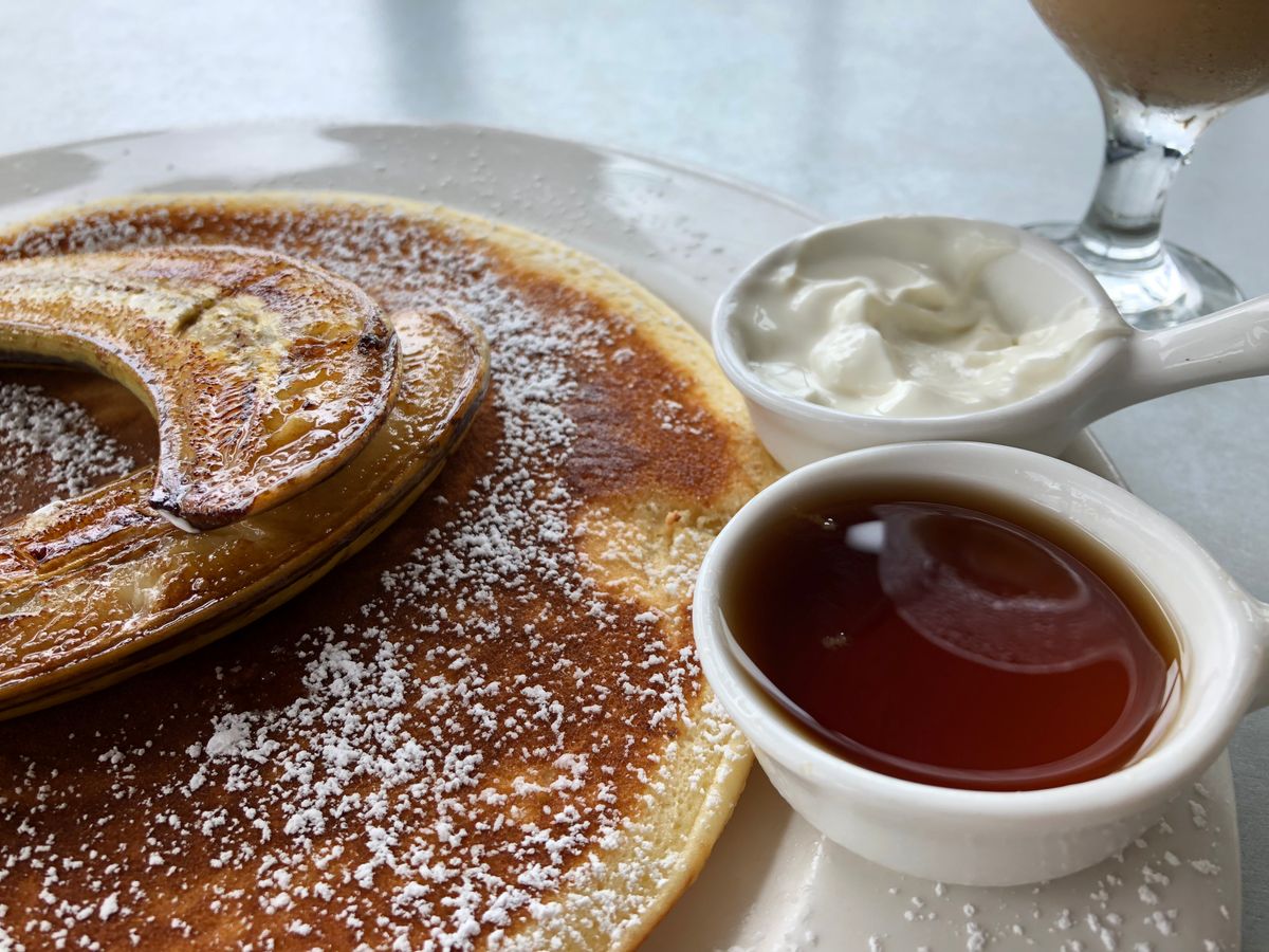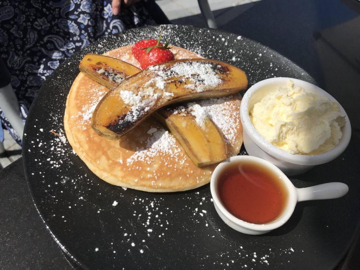 注文したバナナパンケーキは大きなお皿に丁度収まる大きさで、その上に焼かれて甘くなっているバナナが乗っていてとかなりボリュームがありました。