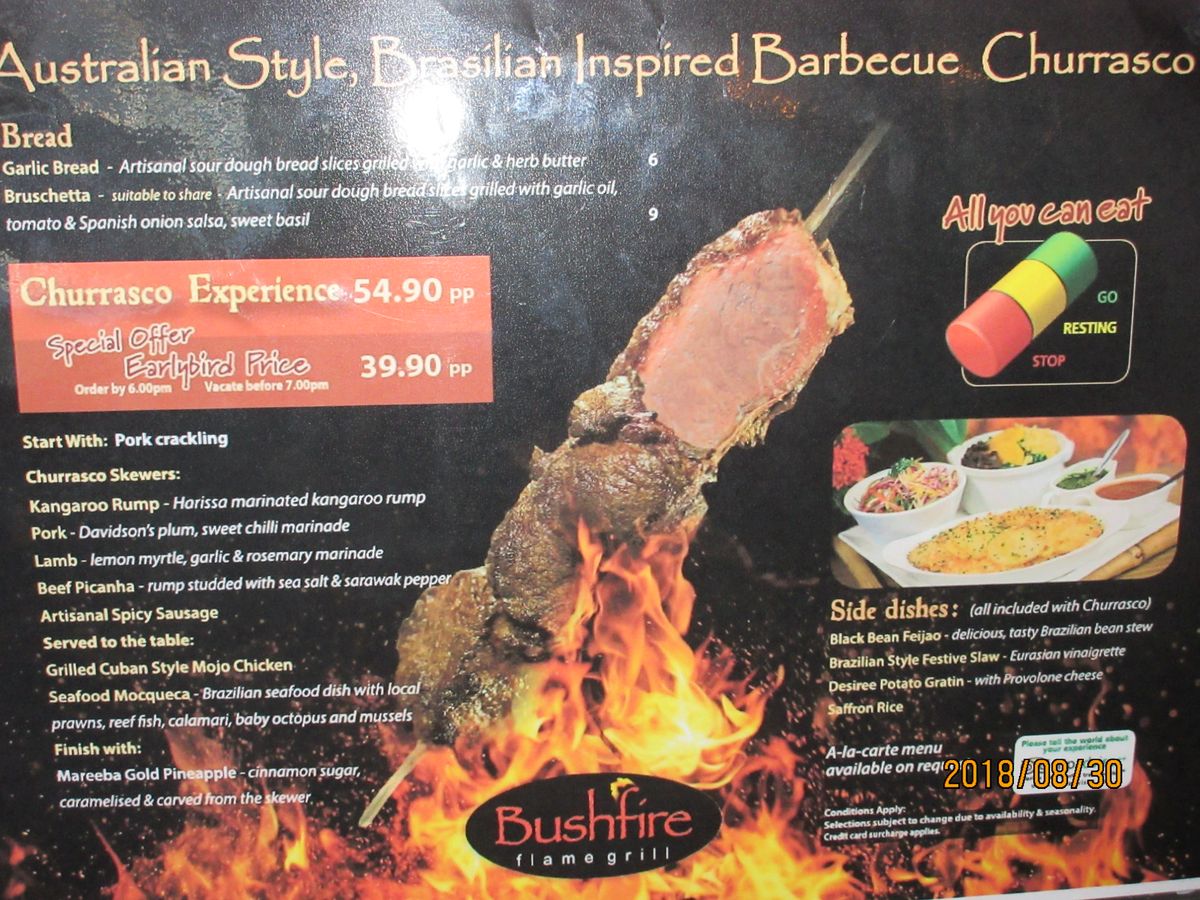 アーリーバードで、オープンと同時だったので、お肉系は一番外側のサーブが多かったので、焦げていてあまり食べれませんでした。2回目からは、内側なので焦げがなくてよかったです。好みもありますが、余り真っ黒なのは、健康に害があると思います。付け合わせも、お替りできました。(一つだけでも大丈夫でした)パフォーマンス性はありますが、おこげは何とかしたほうがいいと思います。