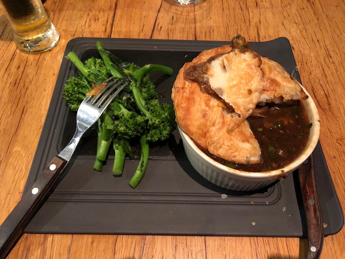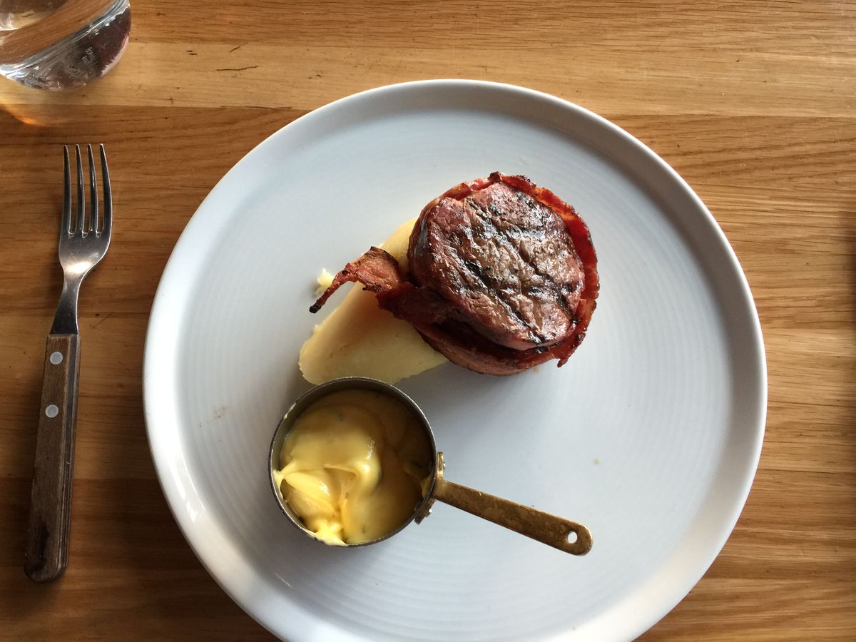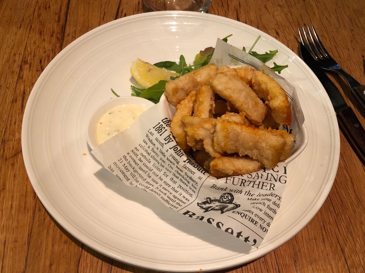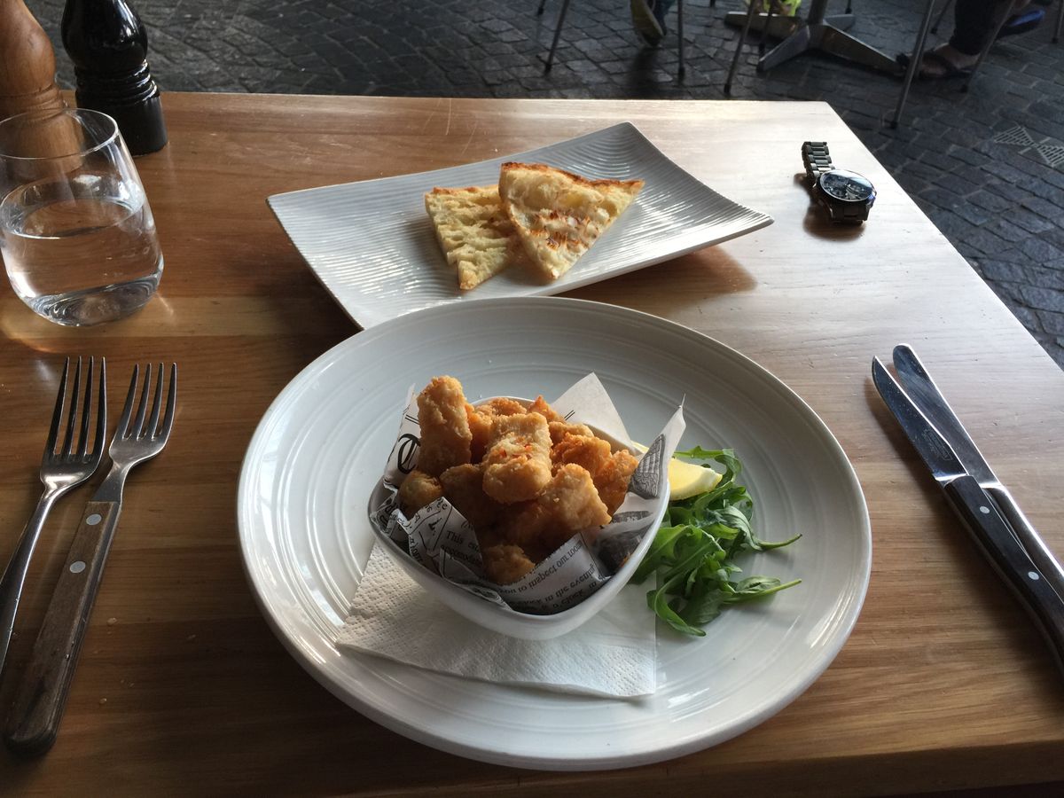 待ち時間もなく、美味しい料理をいただきました。パン、イカのフリッター、ステーキ、デザート、紅茶が出て、おなかいっぱいでした。
