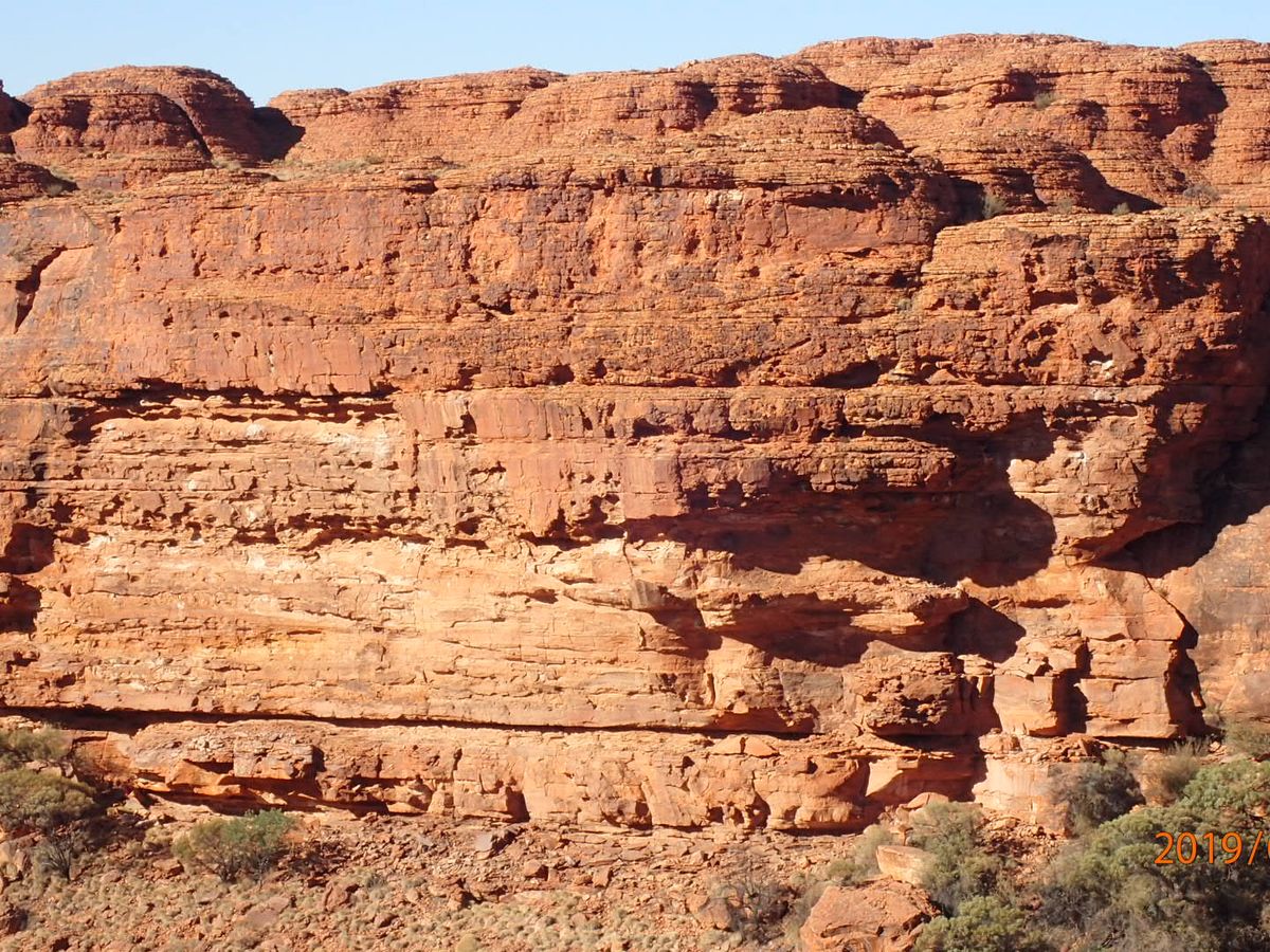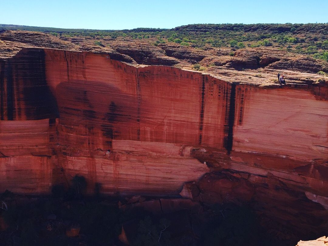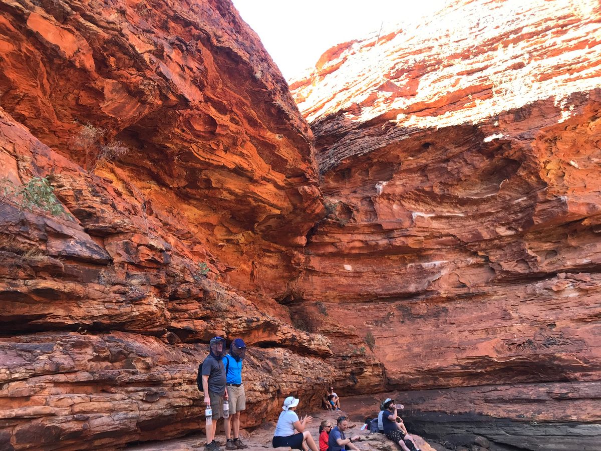 ところどころ休憩しながら、変わりゆく壮大な景色のなかを歩いていきます。6月は冬ですが、昼間は暑く、乾燥しています。ウルル同様、帽子、日焼け止め、ハエ除けネット、水は必須です。ガイドさんは先頭と後ろに2人ついてくれるので安心です。断崖絶壁など、迫力ある景色を楽しめました。オーストラリアの大自然を満喫できて良かったです!