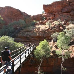 今回ツアー三昧でしたが、このキングスキャニオンが一番絶景でした☆最初の階段だけ少しキツイですが高尾山(東京)より全然楽です。足元はだいたい岩なのでトレッキングブーツで正解でした。朝は雨でしたが、滑るようなところや、手を使って登る事はありませんでした。絶景に夢中になってる内にあっと言う間に登りきりました!本当にオススメです!