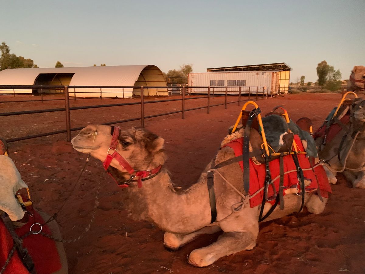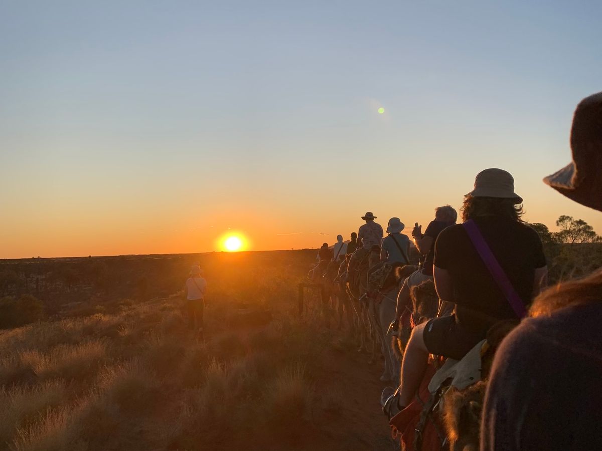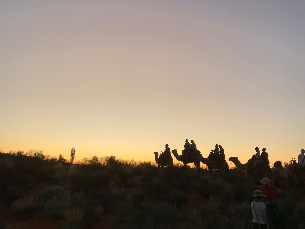 私はサンセットのツアーに参加したので、太陽が西に傾く中、キャメルファームを出発しました。ツアーの引率は2人、ラクダの隊列の先頭に乗っている方と徒歩で隊列の後方をサポートしてくださる方です。ラクダの生態やウルルについてのことなどたくさん教えてくれました。このツアーではエアーズロックにはあまり近づきません。しかし、木などの障害物なしにエアーズロックを綺麗に見渡せる小さな丘にラクダたちが連れて行ってくれます。写真ポイントに来ると、エアーズロックをバックにラクダに乗った姿を撮ってくれます。その後はまた少し進み、サンセットが綺麗に見えるところで止まり、日が沈み切るまでらくだを止めて思う存分写真タイムをとってくれます。日が沈みきるとゆっくりファームまで戻ります。ラクダには計1時間半もの間乗っていました。思ったより揺れるので、酔いやすい方は酔い止めを飲んでくると良いと思います。かなり車酔いしやすい私でもらくだでは酔わなかったのですが、日本人のおば様が酔ってしまい途中からラクダを降りてツアーの方と一緒に歩いていたので。