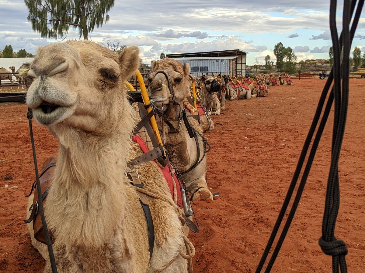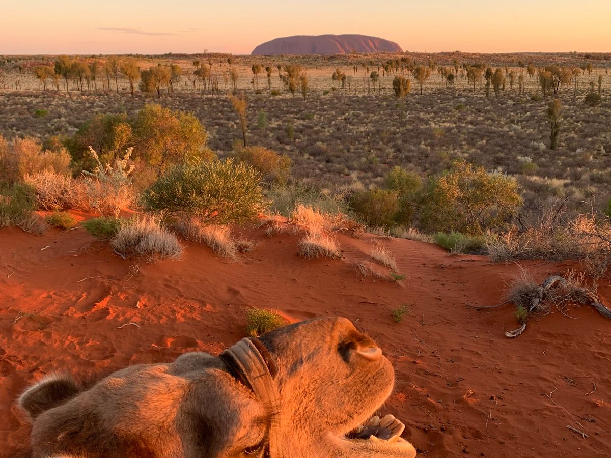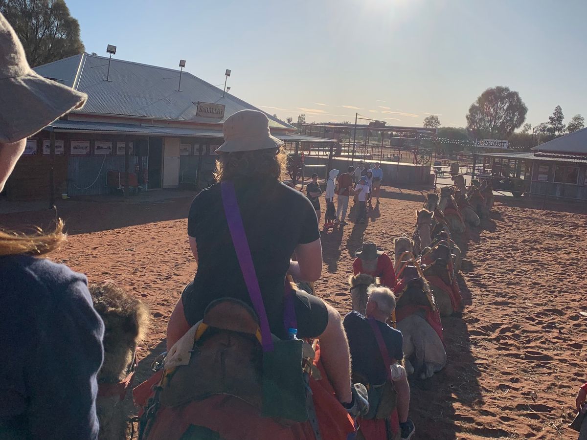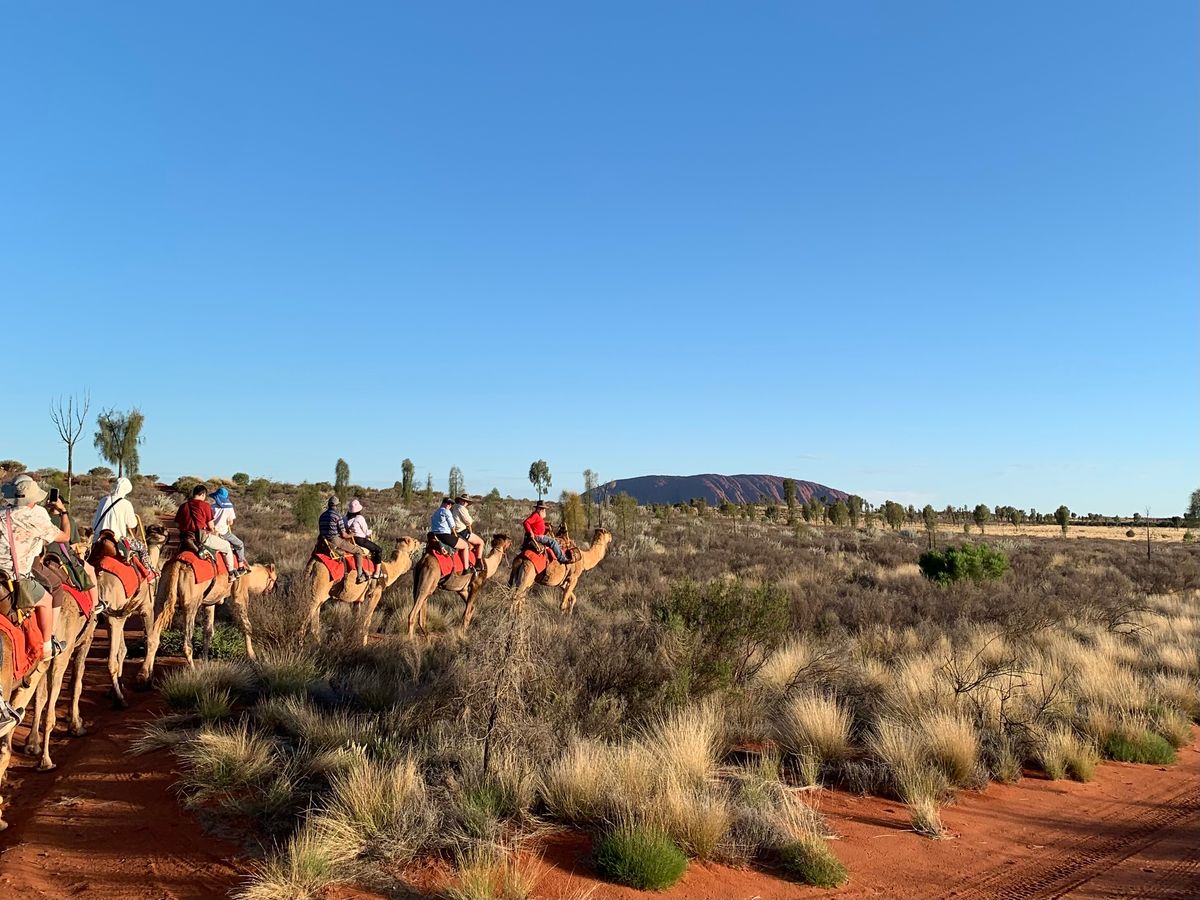私はサンセットのツアーに参加したので、太陽が西に傾く中、キャメルファームを出発しました。ツアーの引率は2人、ラクダの隊列の先頭に乗っている方と徒歩で隊列の後方をサポートしてくださる方です。ラクダの生態やウルルについてのことなどたくさん教えてくれました。このツアーではエアーズロックにはあまり近づきません。しかし、木などの障害物なしにエアーズロックを綺麗に見渡せる小さな丘にラクダたちが連れて行ってくれます。写真ポイントに来ると、エアーズロックをバックにラクダに乗った姿を撮ってくれます。その後はまた少し進み、サンセットが綺麗に見えるところで止まり、日が沈み切るまでらくだを止めて思う存分写真タイムをとってくれます。日が沈みきるとゆっくりファームまで戻ります。ラクダには計1時間半もの間乗っていました。思ったより揺れるので、酔いやすい方は酔い止めを飲んでくると良いと思います。かなり車酔いしやすい私でもらくだでは酔わなかったのですが、日本人のおば様が酔ってしまい途中からラクダを降りてツアーの方と一緒に歩いていたので。
