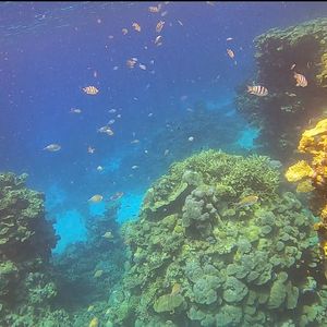 さて、肝心のサンゴ礁見学はと言えば、熱帯の海とは違って、カラフルさはあまりない。カメがいる場合もあるらしいが、ほとんどの場合は色味に欠けた魚ばかり。天気の良い1日ではあったものの、写真のような景色は望めず、それはヘリなり飛行機に乗って、それも海の綺麗な日だけのことのようで。