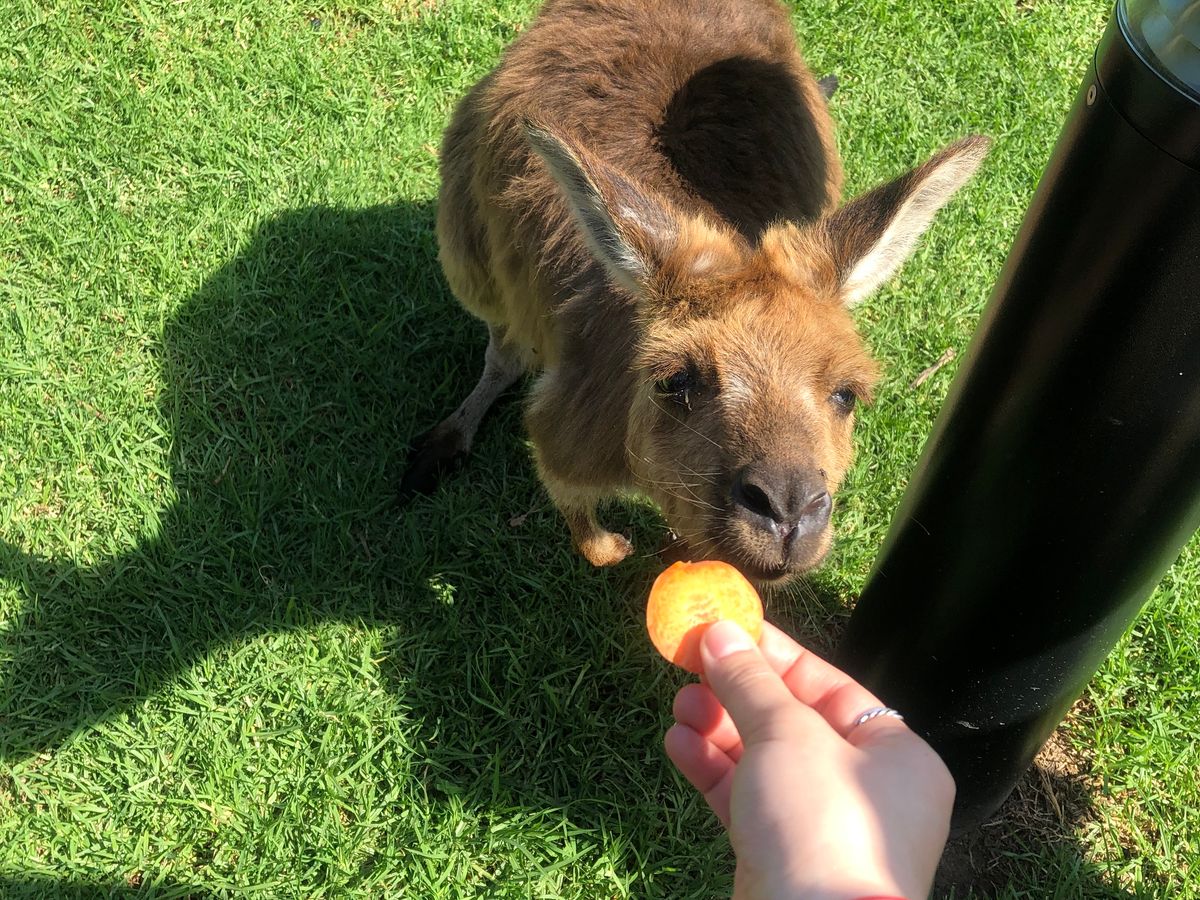 4つ目、ワラビーへのエサやり、の前に少しだけ現地の人がよく使うというローカル食材が売っているお店に寄ります。特にマカダミアナッツなどはケアンズ市内のよりも安く購入することができます。その後ワラビーに会いにグラナイト渓谷に行きます。野生なのですが人に慣れているので、手からご飯を食べてくれます。シェーンさんが教えてくださったワラビーとの自撮り方法ですっごくキュートな写真を撮れます。ワラビーとの自撮りに夢中になり過ぎて後で写真を見返したら50枚以上撮っていました。本当に可愛くて愛おしかったです。他にもヘビを首に巻いたり、インコを肩に乗せて写真を撮ることができます。これらは野生ではなく飼育されているものなので襲われる心配はありません。まさかヘビを首に巻けるだなんて思っていなかったので、少し怖かったのですが良い経験になりました。