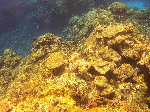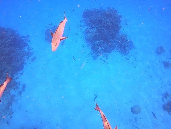 さて、肝心のサンゴ礁見学はと言えば、熱帯の海とは違って、カラフルさはあまりない。カメがいる場合もあるらしいが、ほとんどの場合は色味に欠けた魚ばかり。天気の良い1日ではあったものの、写真のような景色は望めず、それはヘリなり飛行機に乗って、それも海の綺麗な日だけのことのようで。