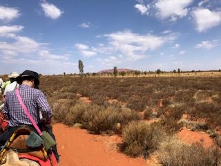 ラクダに乗りながら、朝日をバックにしたウルルを眺める…
