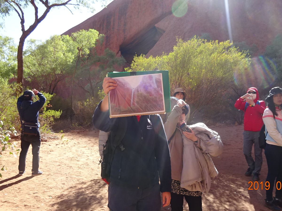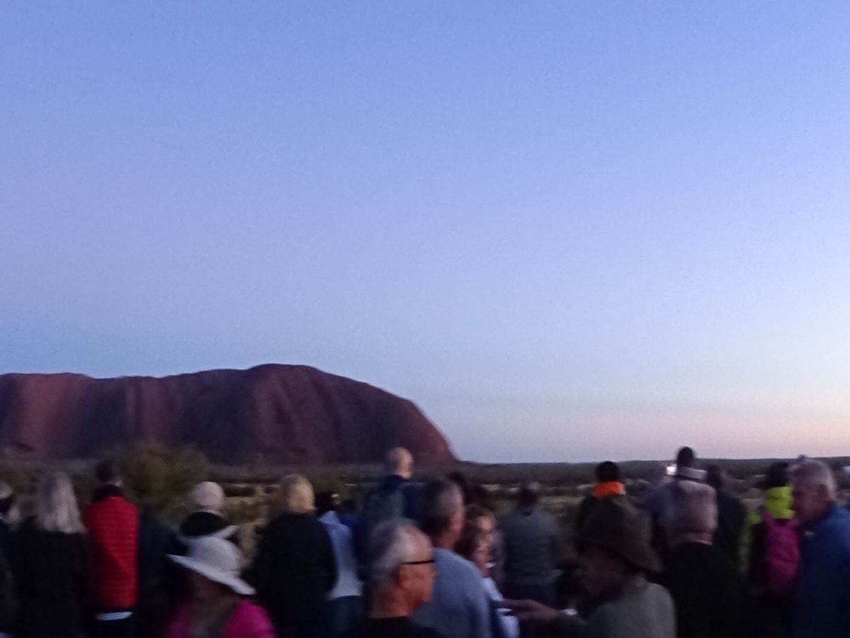 隣のグループは赤く染まりかけたウルルをバックに集合写真を撮ろうとしていて、赤く染まったウルルを見逃したようです。これはよくあるとのことです。