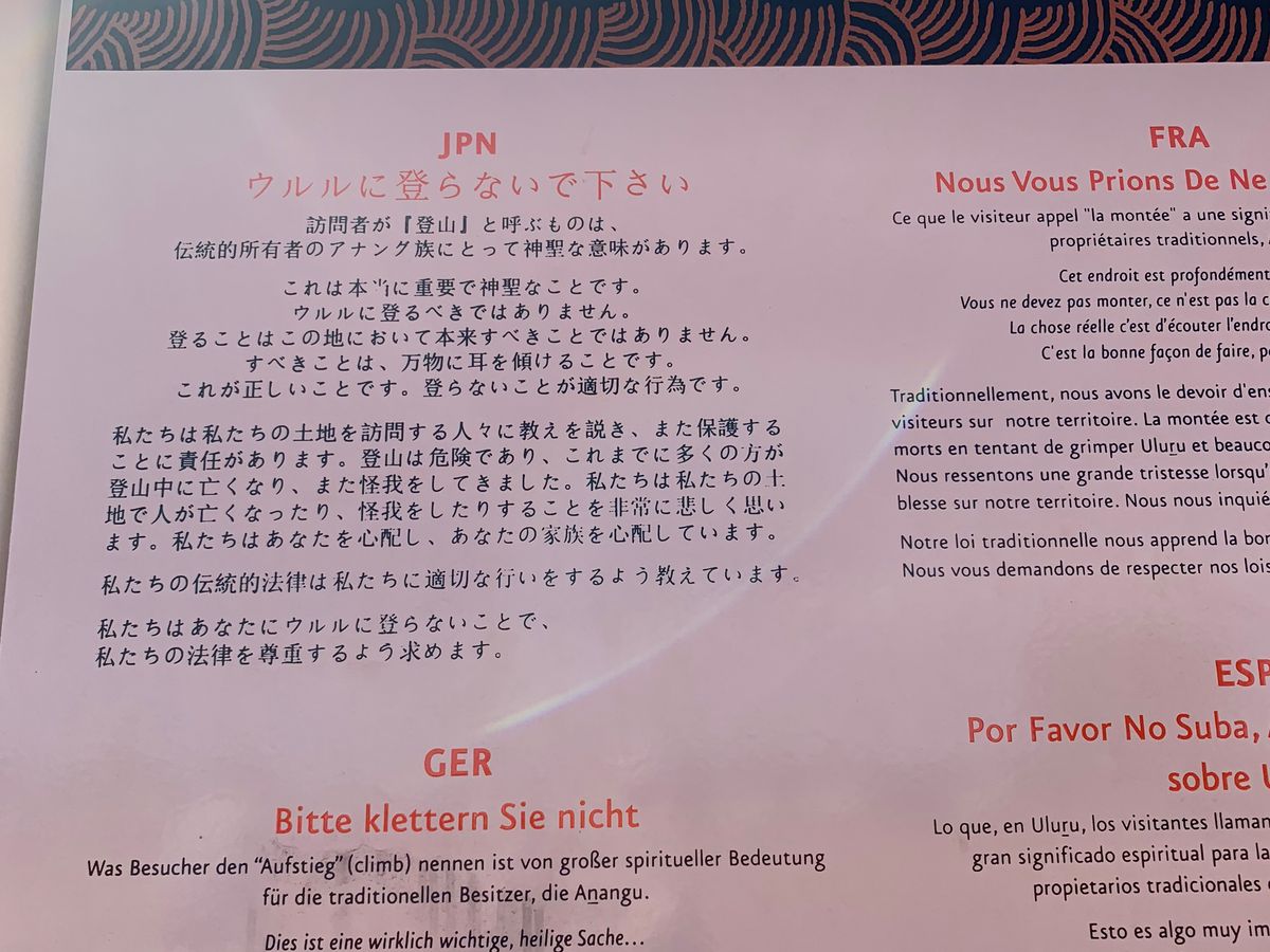 ただ現地ではウルル登頂は全く歓迎されておらず、登山道入口にも各言語ではっきりと登頂はして欲しくないと書いてありました。アボリジニアンの方々の歴史背景や考えを現地でお伺いし、楽しく登山!という場所ではない事を初めて知りました。