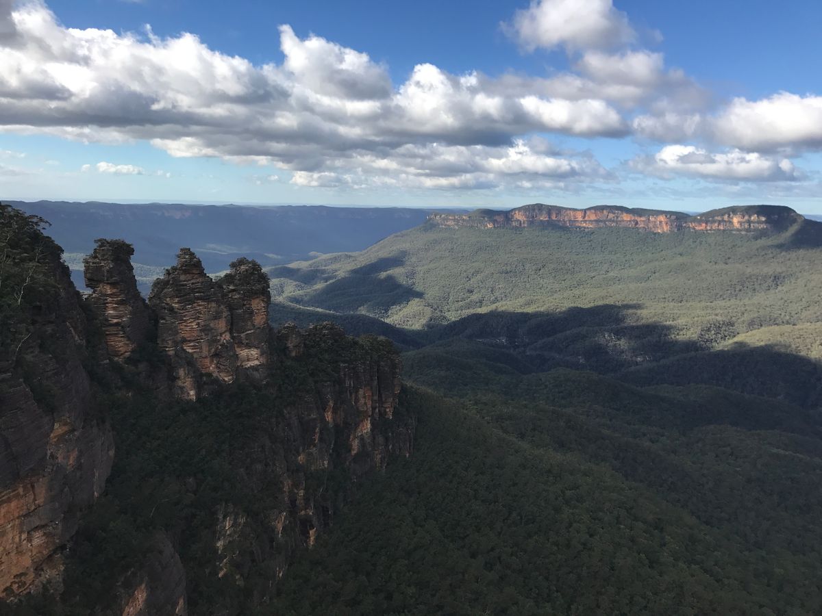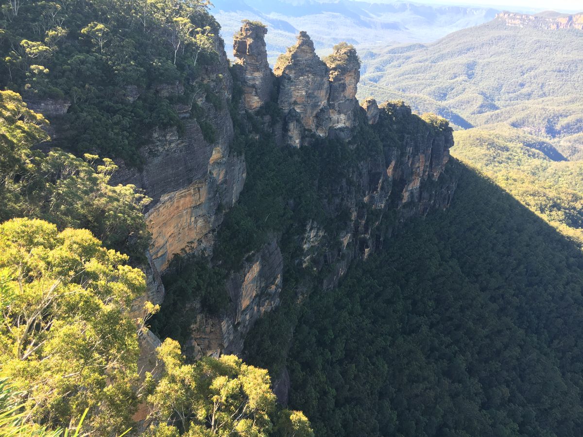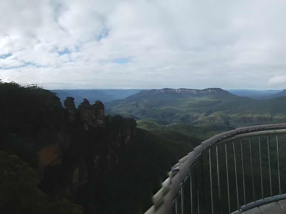 スリリングな断崖絶壁展望地の『キングステーブル』では好天にも恵まれ、うっすらとブルー。ユーカリ樹海と『スリーシスターズ』も、雲が去り美しかった。