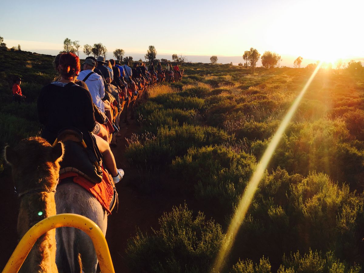 夜明け前にホテルを出発しラクダ飼育場の一角にあるCamel Tourの事務所に集合。持ち物はカメラなど最小限をツアー会社提供の皮ザックに移して肩掛けに。基本的に二人一組になってラクダの乗り降りなど基本動作を教えられる。10組(ラクダ10頭にそれぞれ乗員が2名)程度が繋がれていて、後ろから一組ずつ乗ってラクダを立ち上げるので、全組が揃って歩き始めるまでには結構時間がかかる。ラクダが歩いている間は多少上下に揺れるが、人が歩くよりもゆっくり進むので怖さはない。歩く最中に写真を撮るには揺れが気になるが、小高い撮影ポイントでは停止する(ラクダには乗ったまま)ので、そこで十分撮影の時間はあるし、徒歩で随行するガイドが観光客持参のカメラで撮影してくれる。30分近く歩いているので、真夏でも結構冷える。長袖シャツやウィンドブレーカーはあったほうが良い。事務所に戻ると、熱いコーヒーと軽食が待っている。ガイドが撮影した写真はプリント、CDやUSBメモリで販売している。朝焼けのウルルがきれいに見えるかどうかはまさに天候と雲の流れ次第で、日の出方向に低い雲があると期待外れになるかもしれないが、これは文字通り運を天に任せるしかない。それでもラクダの背に揺れて地平線に日の出を望むのは貴重でさわやかな体験だった。