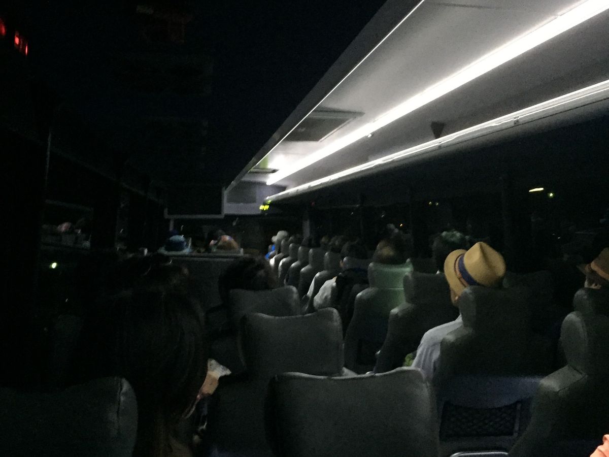 日の出前の出発なのであたりは真っ暗です。そのため、個人で車で行くには心配に感じるかもしれません。しかし、このツアーはWiFiも使える大型バスで迎えに来てくれるので安心しました。