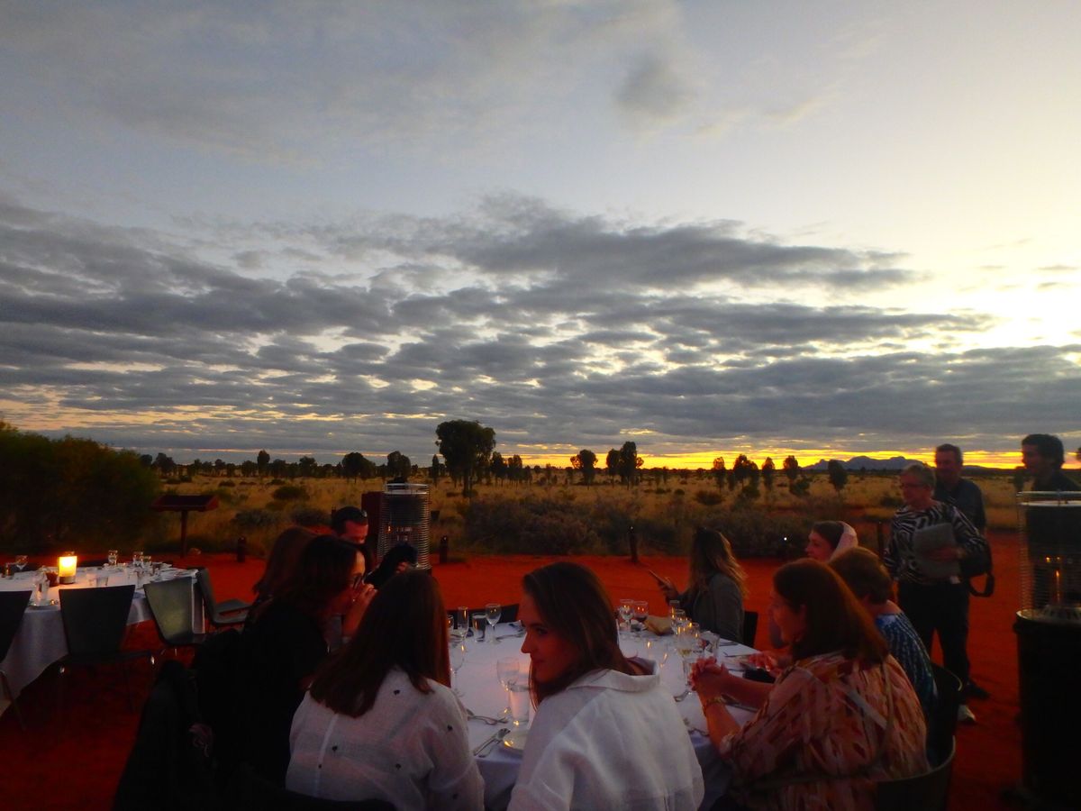 ウルルのサンセットからのディナー。ホテルに迎えのバスが来ます。ウルルと反対に進みます。小高い丘に着くと、シャンパン、飲み物を頂けます。種類もあり、おかわりもできます。カナッペも配られます。ウルルとカタ・ジュタも眺められます。ゆっくりと暮れる雰囲気をあじわいます。そのあとディナー会場に移ります。グループの人数でテーブルが割り当てられ、いろいろな人たちと同じテーブルになります。たまたまオーストラリアの方か、90歳のバースディのお祝いがありました。すごい素敵なことでした。後は満天の星、説明は英語で、少し空に雲がかかってましたが、後では満天の星を見ることができました。