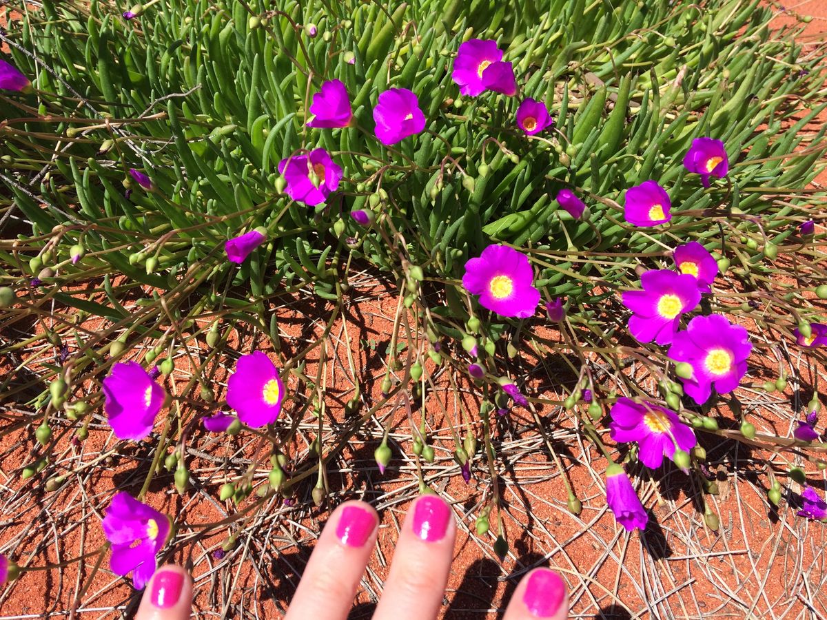 日の出前にサンライズ会場に到着、ホットコーヒーとクッキーなどの軽食で朝日を待ちました。日の出が始まると、パワーを感じます。感動して本当に涙が出ました。エアーズロックに来るまでは、アメリカのグランドキャニオンと同じようなものだろうとそこまで期待していなかったのですが、エアーズロックは時間とお金をかけていく価値のある神聖で本当にパワーにあふれた場所です。丁度9月に訪問した時期が季節もよく、日本ではお目にかかれないワイルドフラワーも沢山ありました。サンライズ鑑賞後は、エアーズロック登山へ。20パーセントの確立でしか登山できないと聞いていましたが、はじめ登山口に行ったときは前日の雨でクローズサインがあったのですが、2度目ダメもとで様子を見にいくとオープン!登山時間1時間半で強風にあおられながら、登頂を駆け抜けましたが、最高でした!