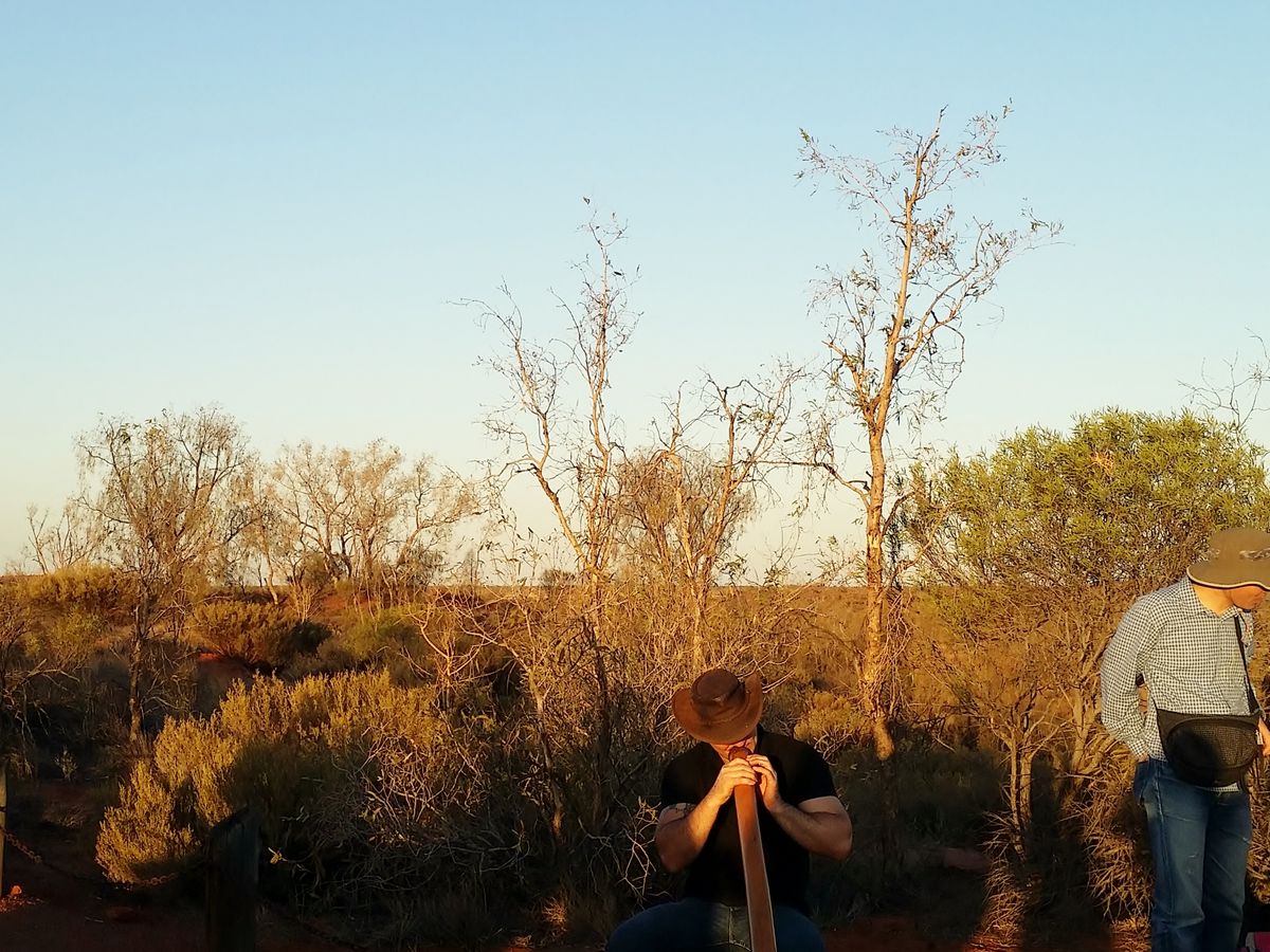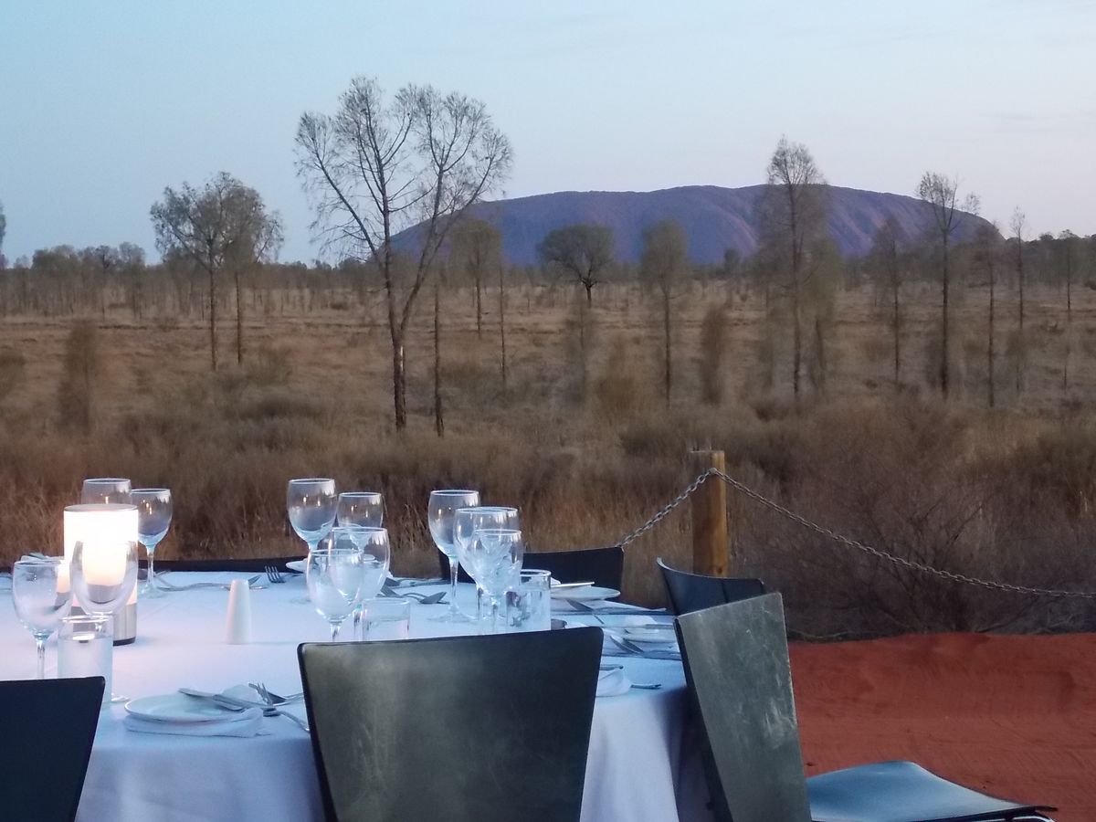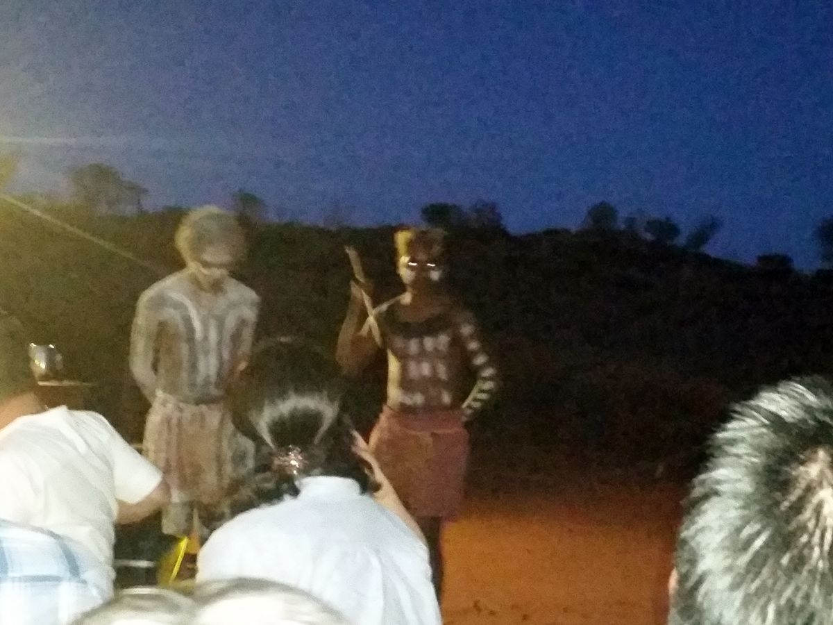 夕方17時頃ホテルにてピックアップ。エアーズロックの見える小高い丘に登ると一人のミュージシャンがアボリジニの民族楽器でお出迎え。音楽を聴きながらブリットとカナッペ。カンガルーのカナッペに初挑戦!私には「ちょっと…」エアーズロックが夕暮れで見えなくなる頃、丘を下った砂漠?ブッシュの中にローソクの明かりに照らされた真っ白なテーブルが目に飛び込んできました。「何という演出!」もうここからテンション上がりっぱなしです。円卓は8人づつ座るようになっていて私たちのテーブルは日本の新婚さんとアメリカの新婚さん、イギリスからやってきた初老夫妻でした。さて話も弾み食事(メインはブッフェスタイルですがギャルソンがエスコートしてくれるので混雑なしです)も終わりアボリジニダンスのあと、真っ暗な中で星座の話(日本で言う所の織姫と彦星みたいな話でした)を聴いていると眼が暗闇に慣れてきてとても幻想的な気分になれます。そんな中大きな流れ星が・・・今宵は非日常的な環境でのお酒、食事、お話と、とても心地好く酔いました。